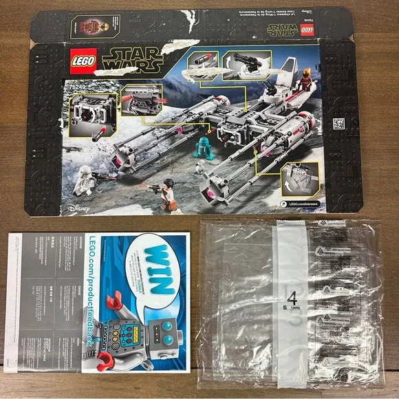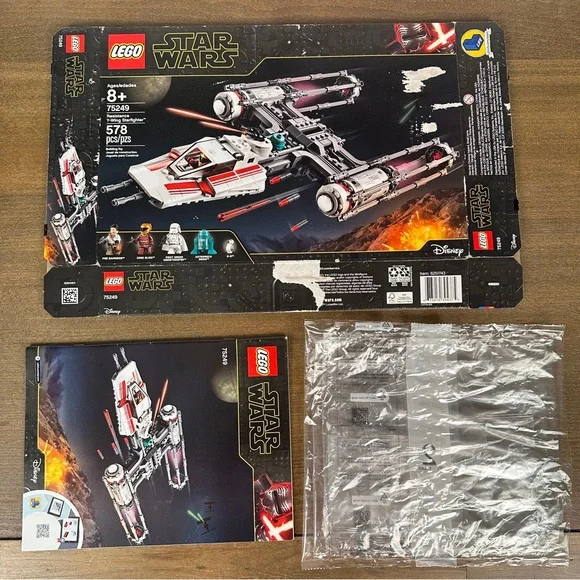 This listing is for the authentic set 75249 RESISTANCE Y-WING STARFIGHTER from the Star Wars line from the year 2019. This set is 100% complete. It is in like new condition. All minifigures are like new with no cracks or blemishes. Adult owned and displayed. Come with box, instruction manual, original bags, and extra pieces. The box does have some damage to it.Includes sw1052 Astromech Droid, K3-R1sw1051 D-Osw1053 First Order Snowtrooper with Capesw1049 Poe Dameron (White Shirt)sw1050 Zorii BlissWhat you see in the photos is exactly what you will receive. Please review all photos carefully and zoom in for exact condition and detail as the photos are part of the description. This will come partially or completely disassembled for shipping and will be shipped with great care. Building instructions can be found on the website. Please ask any and all questions before purchasing. Thank you!