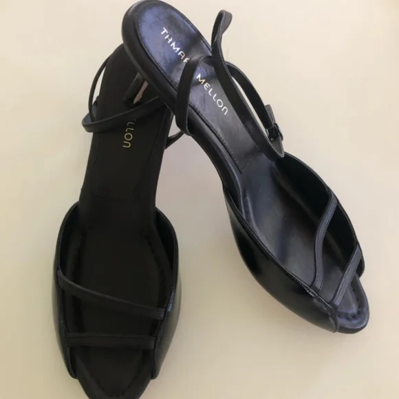 These sophisticated black heels by Tamara Mellon feature a sleek strappy design with a thin ankle strap for a secure fit. Crafted from shiny patent leather, they boast a classic kitten heel of medium height, perfect for formal occasions. The open front with delicate straps adds a touch of elegance to any outfit.