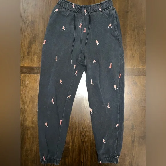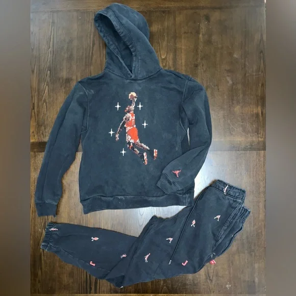 Mens Size Small hoodie has the Jordan logo stitched all in the front. The pants have different images of Jordan with the ball and J’s all over. The set is in normal wear...