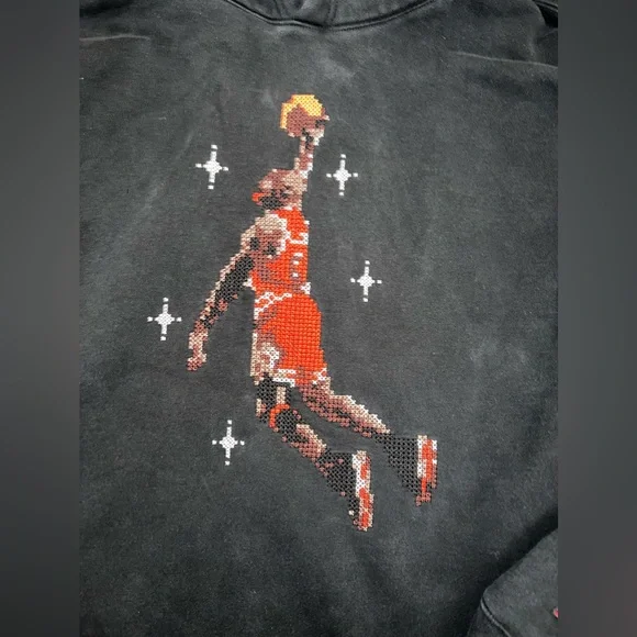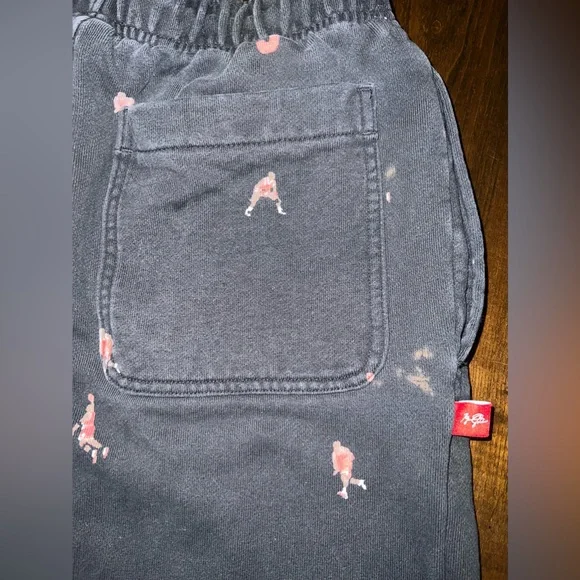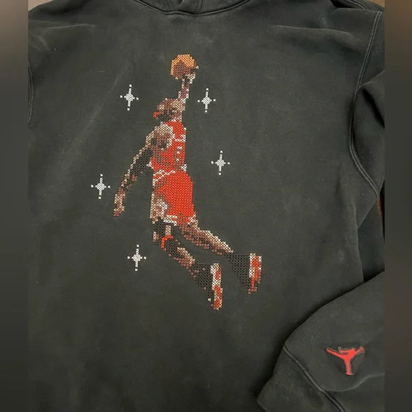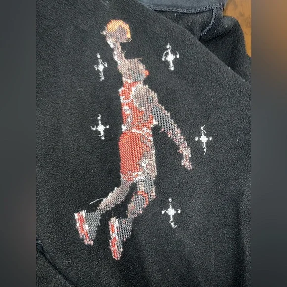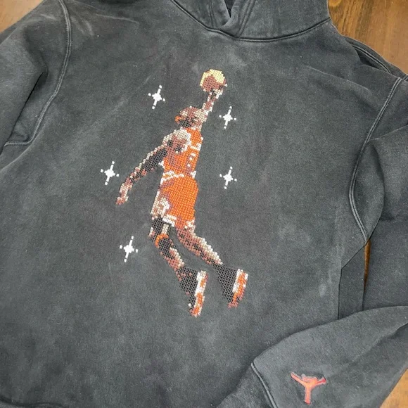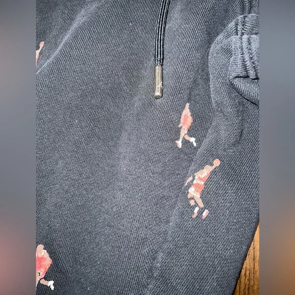 Mens Size Small hoodie has the Jordan logo stitched all in the front. The pants have different images of Jordan with the ball and J’s all over. The set is in normal wear condition. On the side of the pants it looks like there is a Clorox stain as shown in the photo but I thinks it’s a spot wear one of the images was. Message me with any questions :)