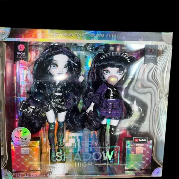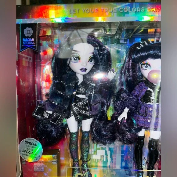 Collectible Rainbow High Shadow Twins Naomi Storm & Veronica Storm Special EditionNRFB; Items are new and never removed from box but box is perfectly imperfect with some imperfections.There is a ding on plastic and slight tear on flaps of box; evidence of shelf wear. Tried to capture defects which are featured in photographs. Item is new an in no way affected by box issues.Orders Ship Fast!Orders are processed quickly and ready to ship within one business day.Please be mindful of purchases made on weekends and holidays as those days are not Business days to ship.
