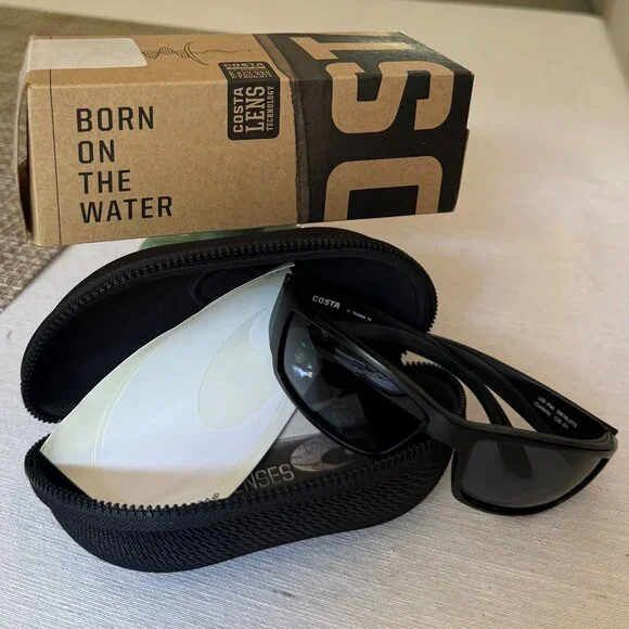 Almost new, one small scratch on left lens, see photo. Comes with original case, sticker and box.Sharp seas call for sharp shades. Costa Corbina sunglasses boast sharp angles and wide temples, no-slip Hydrolite™ construction and head-turning style. Polarized, built to withstand any fishing adventure and perfectly balanced between rugged and refined, these Costa men´s sunglasses are perfect for the Voyager and the Angler, whether that´s on the water or at port, working the tides on a paddle board or fishing a hidden cove.Model name: CorbinaItem no: CB 01 OGPFrame color: BlackoutLens color: GrayLens material: Polarized Polycarbonate (580P)Frame fit: RegularSize: LNosepad adjustable: NoLens curve: Base 8 DecenteredCosta 580® lensesCosta 580® lenses were designed by in-house light spectrum experts to enhance colors because standard sunglass lenses fell short.The lens´ multipatented technologymanages light by:Absorbing Harmful High-Energy Blue Light (HEV)Enhancing Reds, Greens, and BluesFiltering Out Harsh YellowPremium Polarized 580 Lenses*Filtering reflective glare is essential for anyone on the water or outdoors. We sell only polarized sunglasses.100% UV ProtectionYour Costas absorb 100% of UV light, providing you the best in light management and protection.Scratch Resistant and DurableThe C-Wall coating provides extra scratch-resistance and a barrier that repels water, oil and sweat for easy cleaning.