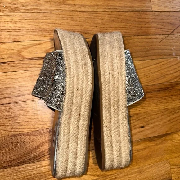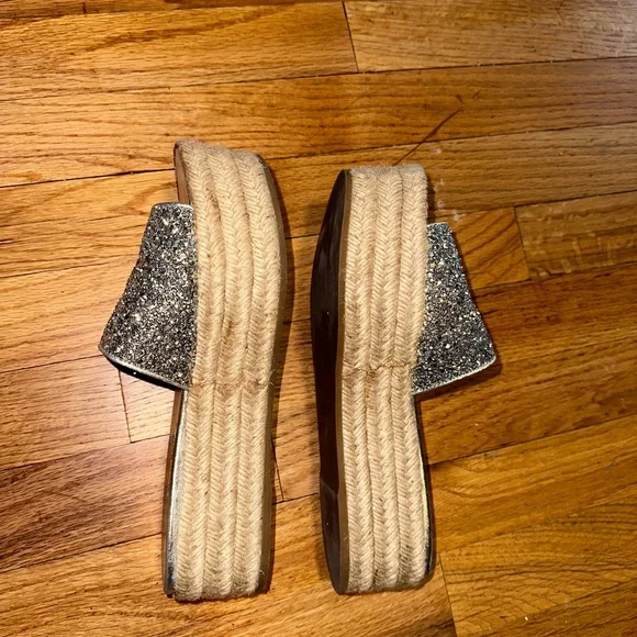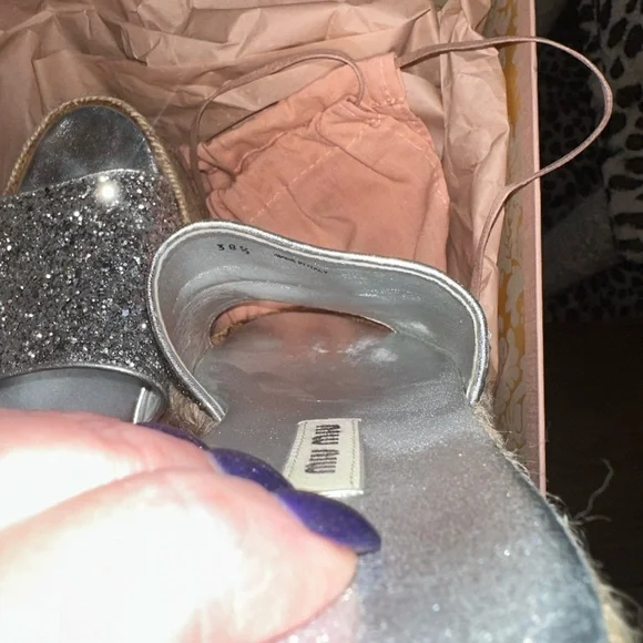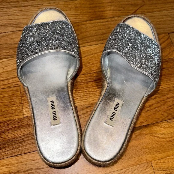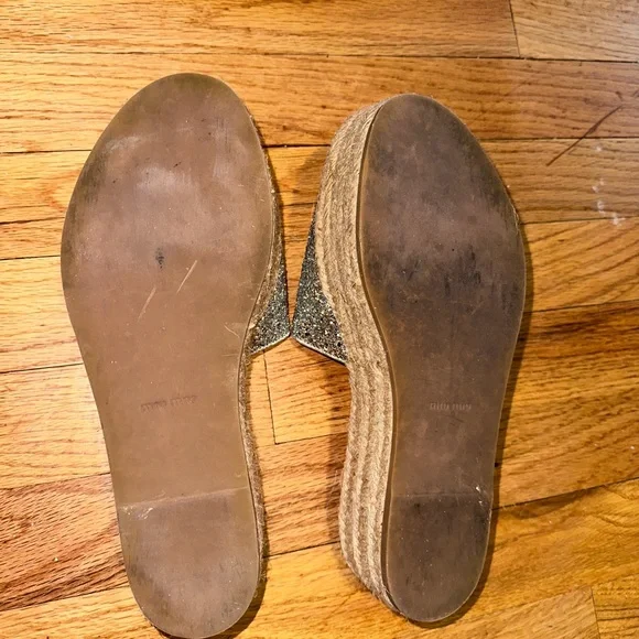 Miu Miu Calzature Glitter leather espadrille wedge slides size 38.5Only worn a handful of times . Near new condition with very minor blemishes. You won’t see the blemishes when you wear them because it’s mostly on the soles.