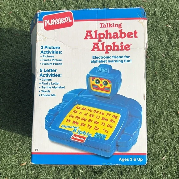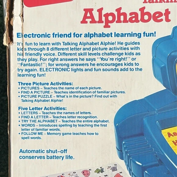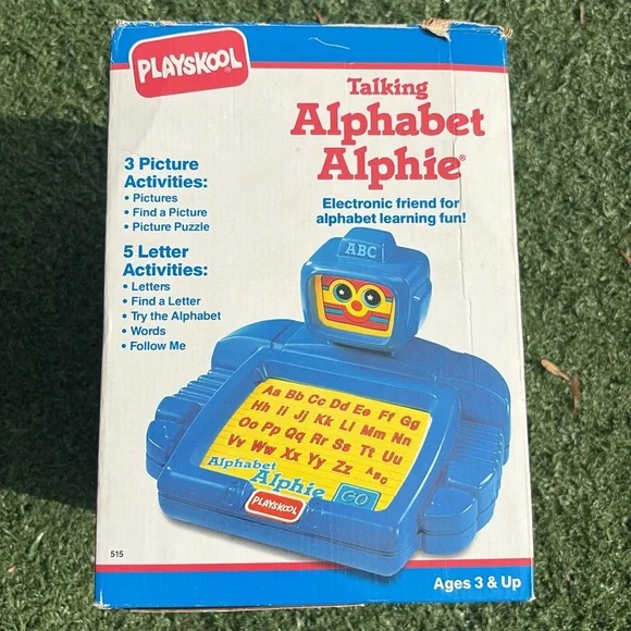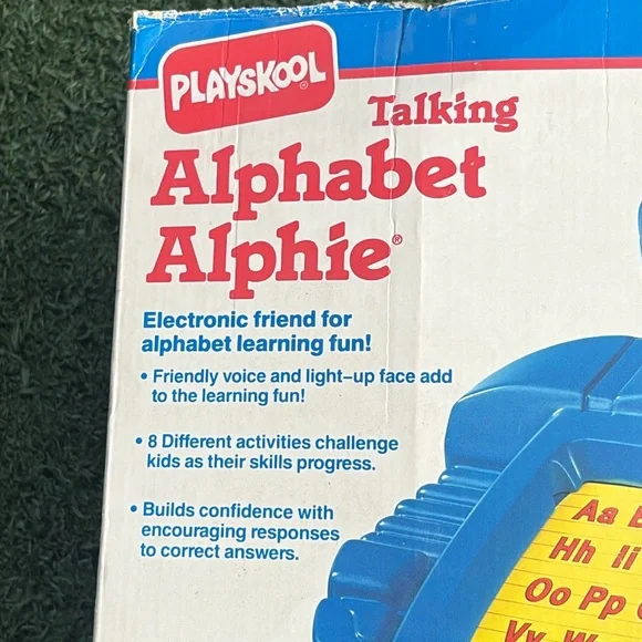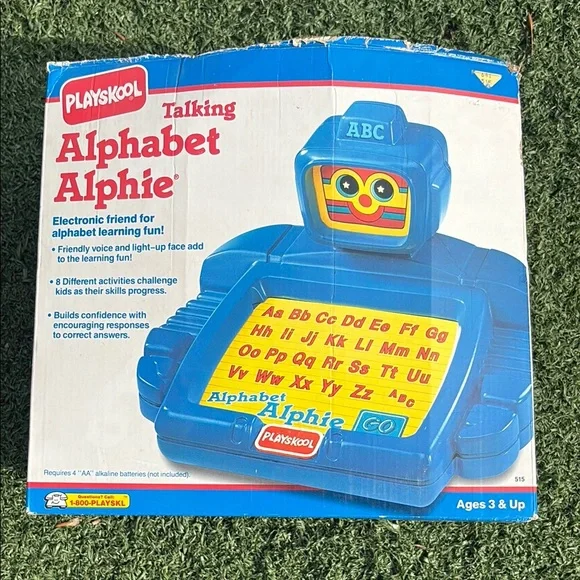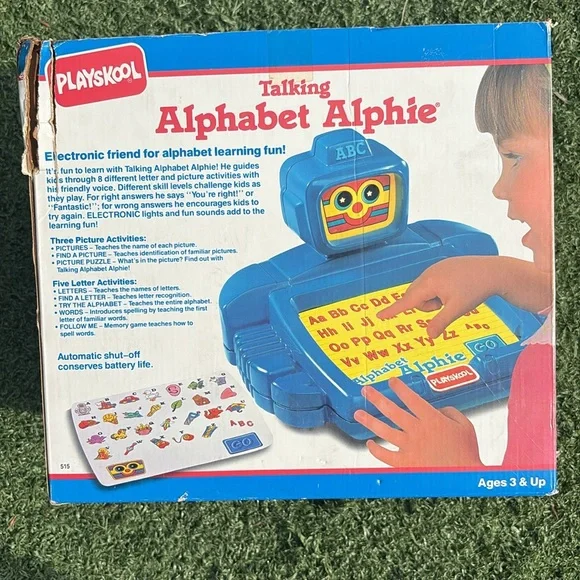 Vintage 1992 Playskool Talking Alphabet Alphie Electronic Robot is in excellent condition and WORKS great. Lights work in his face when he talks and buttons respond when pressed. Only needs 4 AA batteries. Great learning toy that helps children learn the alphabet with the friendly robot named Alphie. Friendly voice and simple directions. Retro toy and ideal for collectors. Comes in original box (no top to box). Original instruction sheet also included. Smoke free home. Fast shipping.