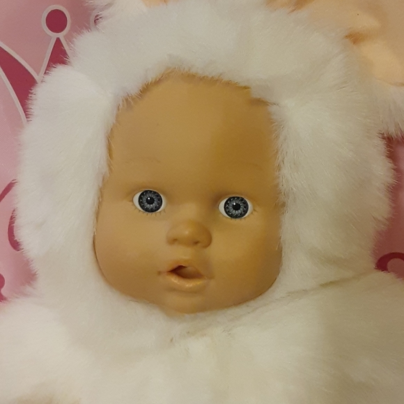 Adorable baby doll faux fur bunnyGood used condition 12" high plastic face light blue eyes open mouth for feeding Vintage jointed legs and neck.Gift wrapped free