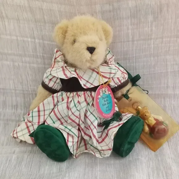 Vintage Muffy Vanderbear Stuffed Plush Bear, Deck the Halls with Bows and Dollies Collection, 1999. North American Bear Co Inc. RARE FIND! Adorable collectible bear has a crisp taffeta holiday dress in red, green, white gold metallic plaid, embellished with working buttons, puffy sleeves, neck ruffle, and green velvet ribbon. Her legs are jointed, and she has the cutest green velvet mary jane shoes, original tag, the original ornament still sealed, and a stand / hanger. Very Good Vintage Condition. Ornament packaging is sealed but has yellowed over time. Dress has a couple of very faint discolored areas, some laundry TLC may remove them. Smoke Free Home.Item#35660 Bin 15