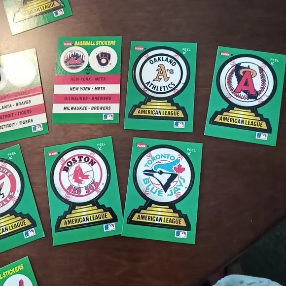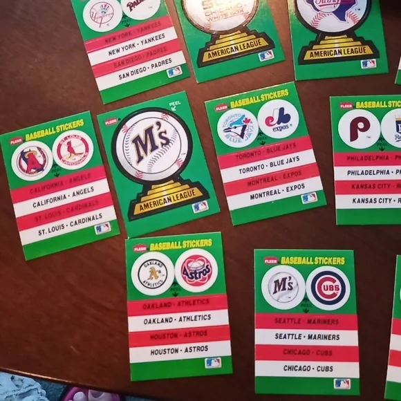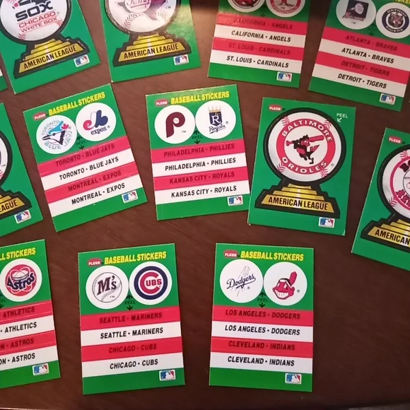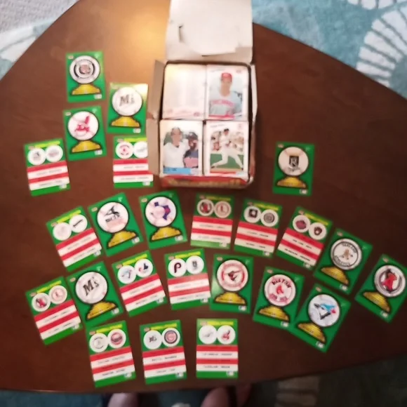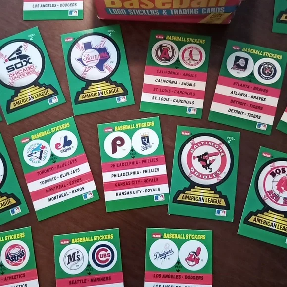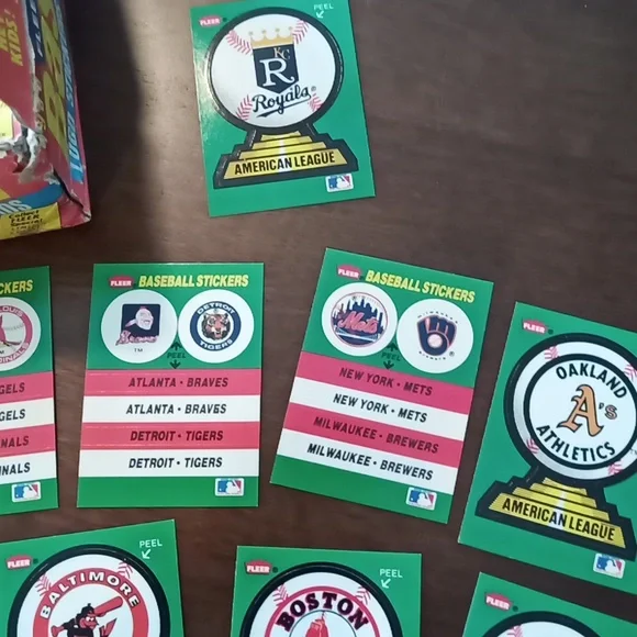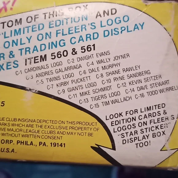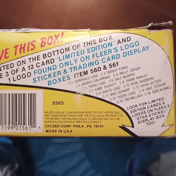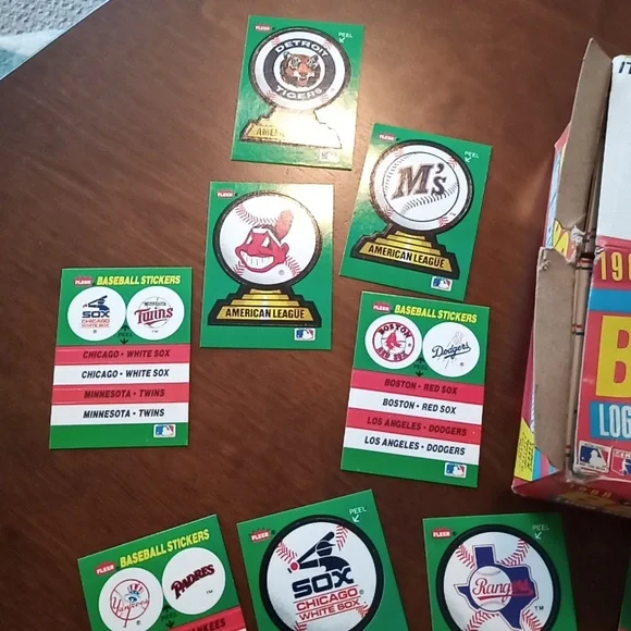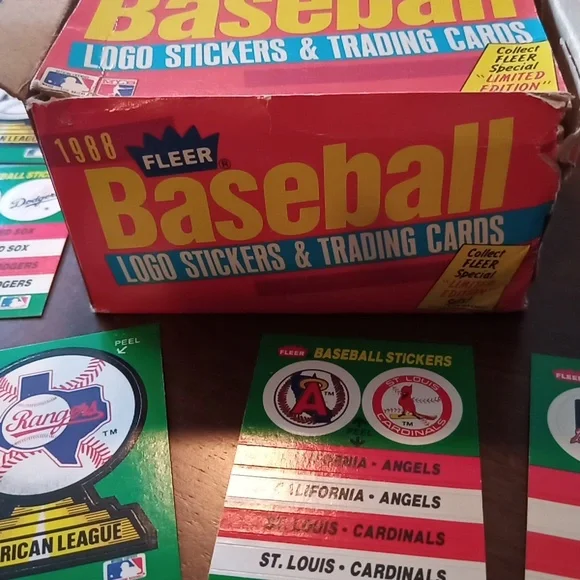 1 large box of Vintage 1988 FLEER Baseball Logo Stickers & Trading Cards.It says b ox #561.I counted 1 row and it was about 120 cards, so I am guessing about 500 with the cards on the back and the stickers and trading cards total but did not count it all. Printed on the bottom of the Box are three of a 12 card limited edition and One logo found only on FLERS logo sticker and trading card display boxes item 560 and 561. this box has names of people inside on the pics above.That is all I know about them.They were my brothers.