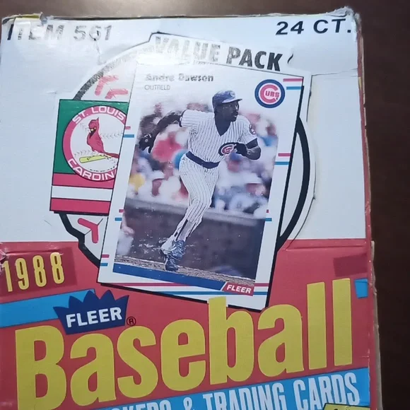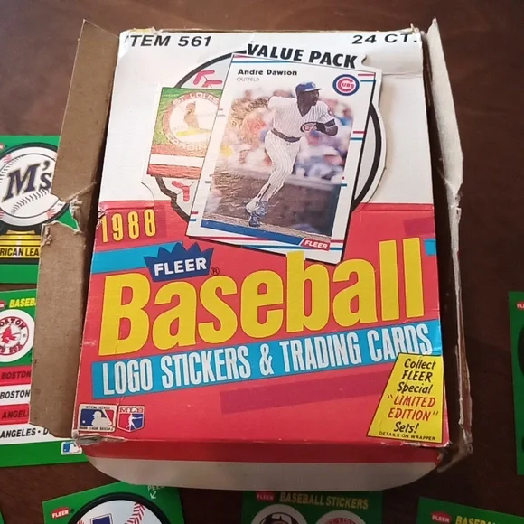 1 large box of Vintage 1988 FLEER Baseball Logo Stickers & Trading Cards.It says b ox #561.I counted 1 row and it was about 120 cards, so I am guessing about 500 with the cards on...