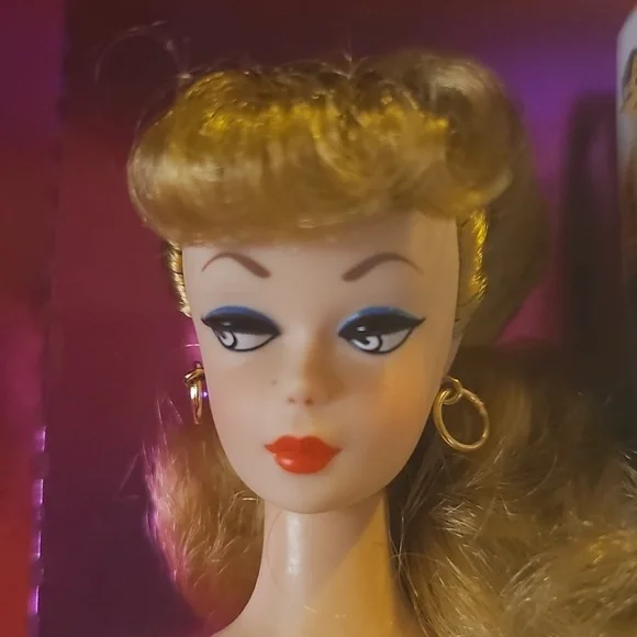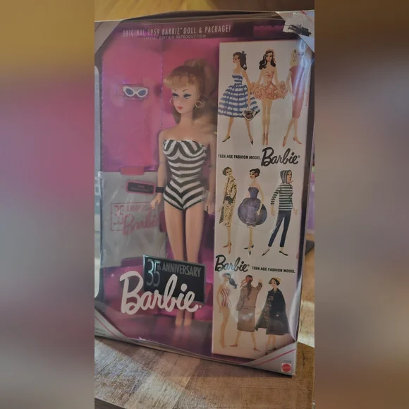 Vintage 1993 Mattel, 35th Anniversary Special Edition Reproduction 1959 Barbie #11590.Wearing a reproduction of the original black and white stripe swimsuit, packaged with a reproduction of the original dolls box *(bottem seal is unsealed), and sporting that famous blonde ponytail, with accessories.
