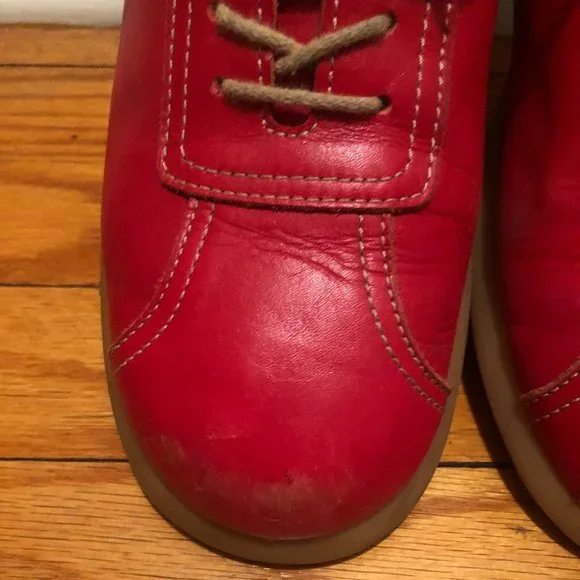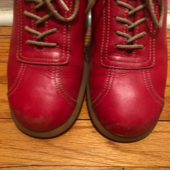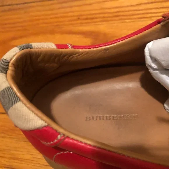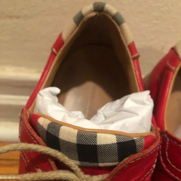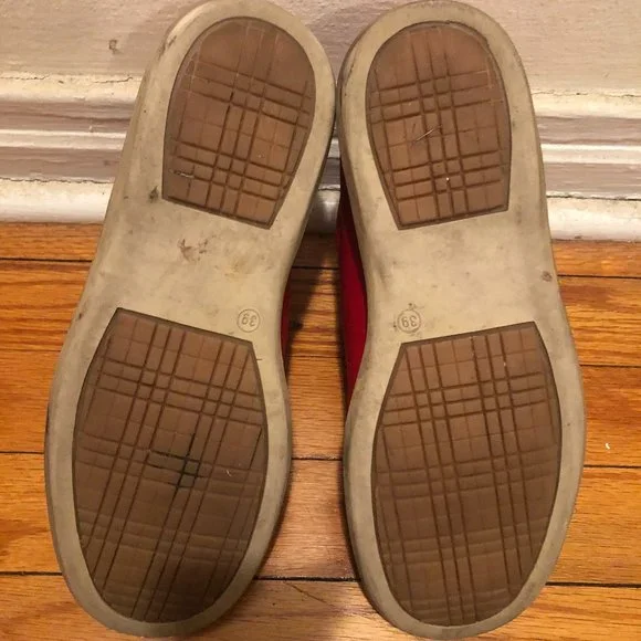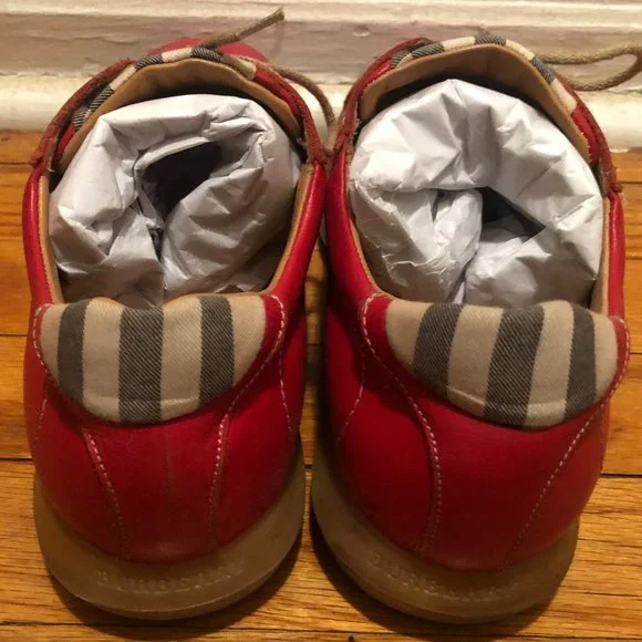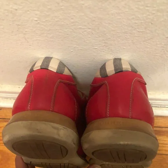 Women 100% AUTHENTIC Burberry red loafer/sneakers with the Burberry check on tip of the tongue and back of the sneaker.