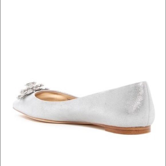 Details:* Pointed toe* Crystal brooch vamp detail* Slip-on* Lightly padded insole* Approx. 0.5" heel* Materials: Leather upper, leather lining & sole* Comes in original box with dust bag* Color: SILV METSD