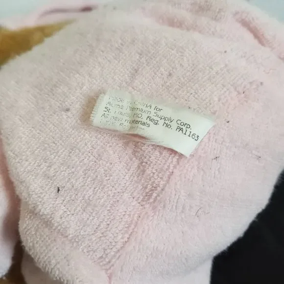Vintage Luv Bunch Stuffed Brown Teddy Bear wearing cozy pink terry cloth pajamas trimmed in signature 1991 floral print and pink terry cloth night cap. Adorable stuffed animal for your collection. Measures 12" from head to toe. Condition: Bear is in very good condition. Terry cloth pajamas shows some pilling, pom pom is missing from cap. Smoke Free Home.Item#35476 BIN20