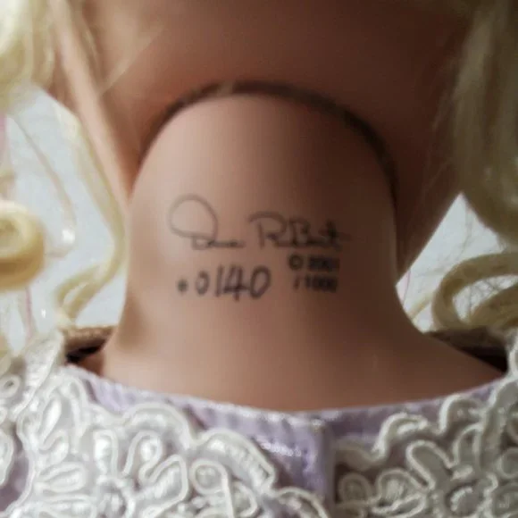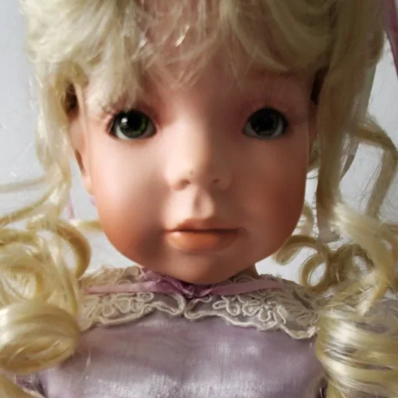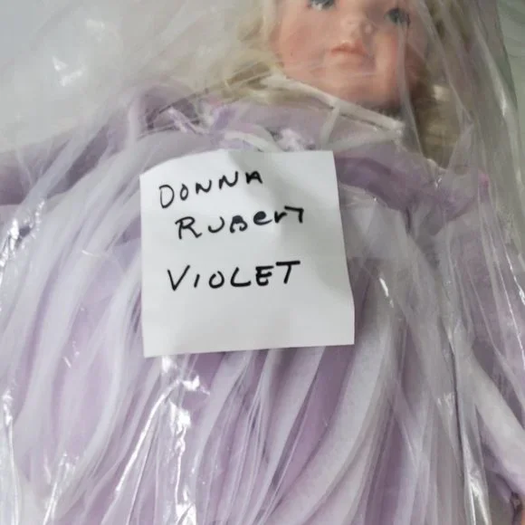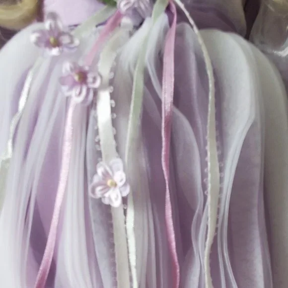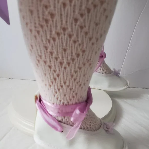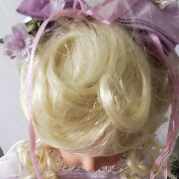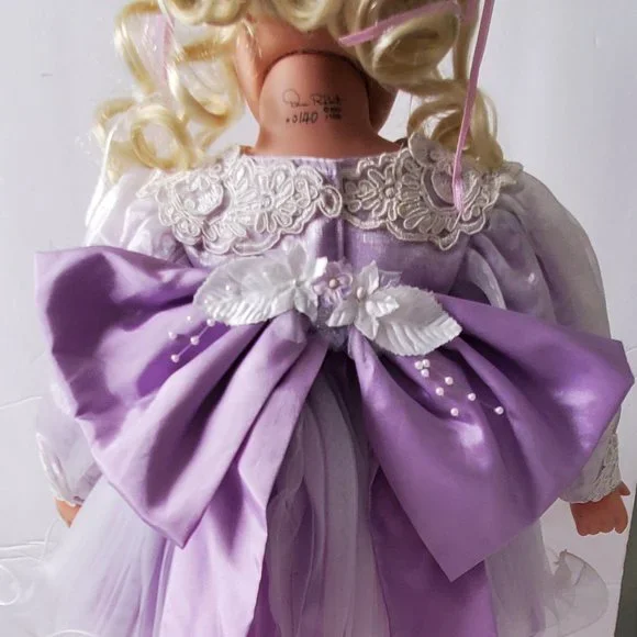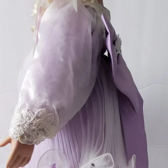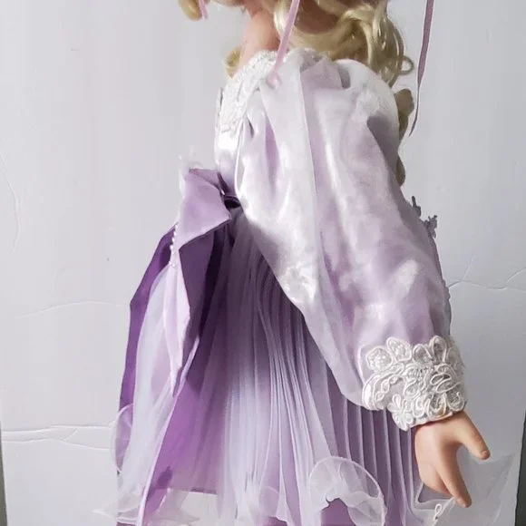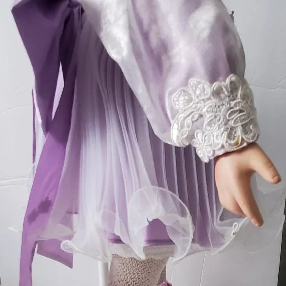 Violet # 0140/1000 Purple Laymay (Lilac) pleated skirt with lace edg sleeves and mini satin bow roses * matching headband with tiny flowing ribbon * Blond Curly hear and blue eyes * white shoes with white lace tights * standing at 24" with stand * with packaging will be over label weight * #1
