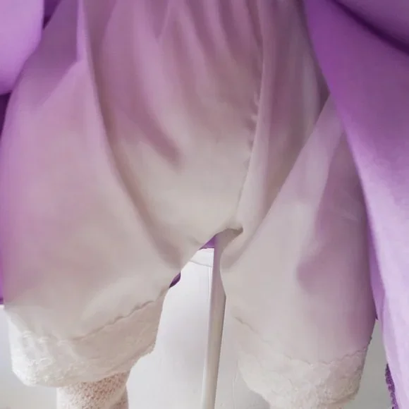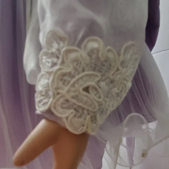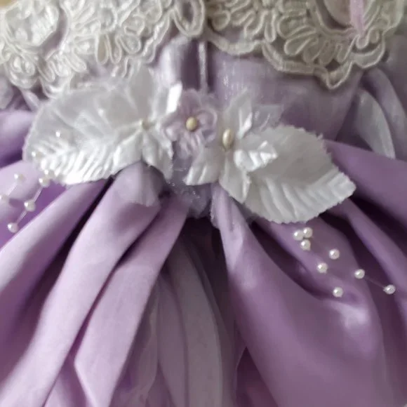 Violet # 0140/1000 Purple Laymay (Lilac) pleated skirt with lace edg sleeves and mini satin bow roses * matching headband with tiny flowing ribbon * Blond Curly hear and blue eyes...