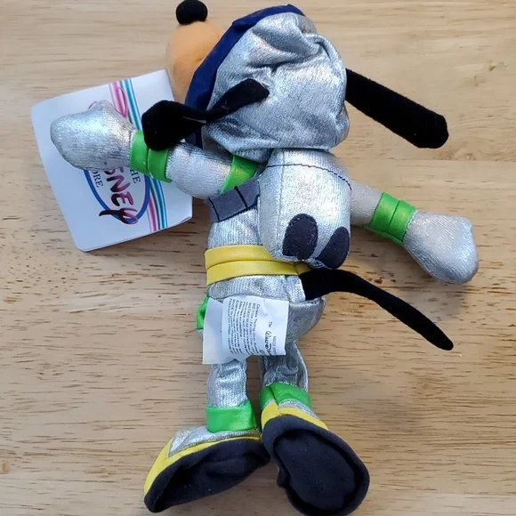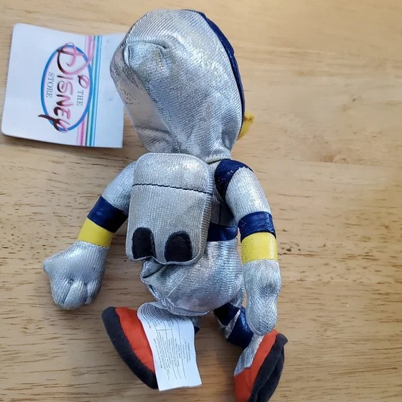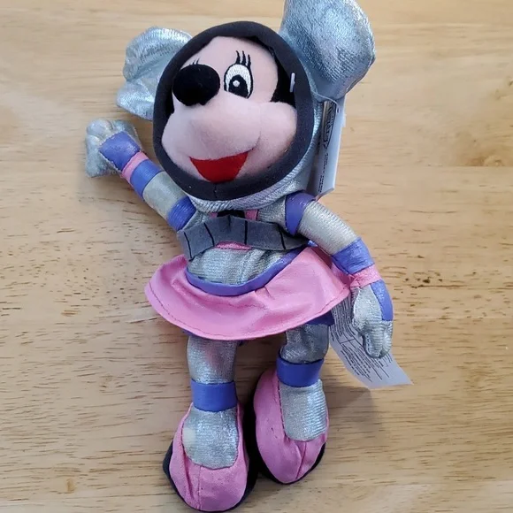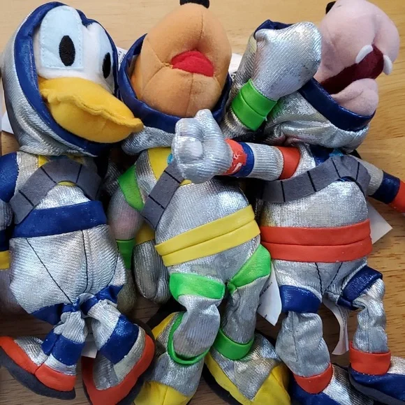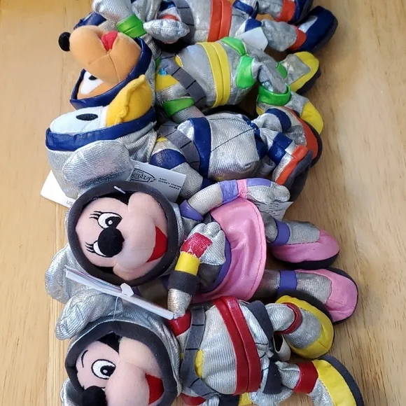 Vintage Fab 5 in silver space suits from Tomorrow Land includes:* Spaceman Mickey* Spaceman Minnie* Spaceman Pluto* Spaceman Goofy* Spaceman DonaldIn original shipping packaging. I don´t know what the silver material is on the suits but it is somewhat tacky and some coming off so I wrapped each in tissue and put back in bag. Maybe they need air so I left them out awhile