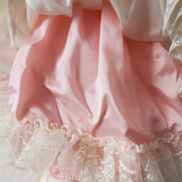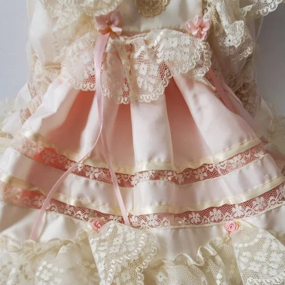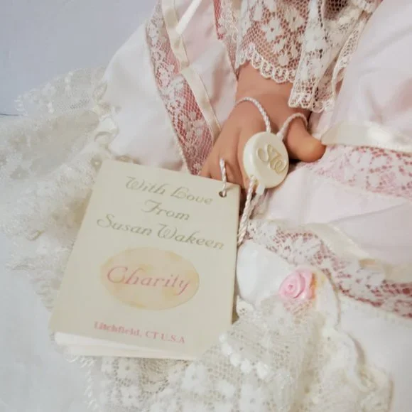 Vintage Susan Wakeen Charity 20" sitting doll #124/750 has a multi layer pink and ivory lace dress white panties lace slipper socks with ivory bow lace petafore dress trimmed with...