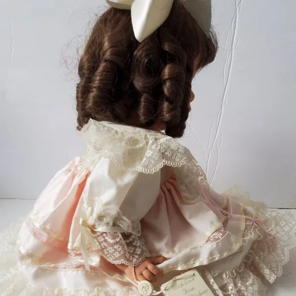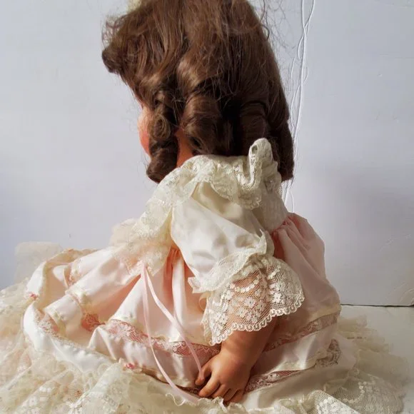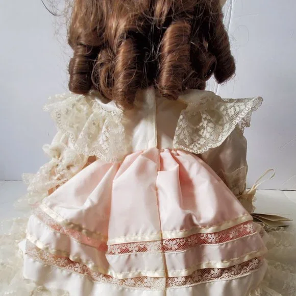 Vintage Susan Wakeen Charity 20" sitting doll #124/750 has a multi layer pink and ivory lace dress white panties lace slipper socks with ivory bow lace petafore dress trimmed with danty pink bows with a matching head band on her curly brown hair