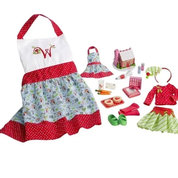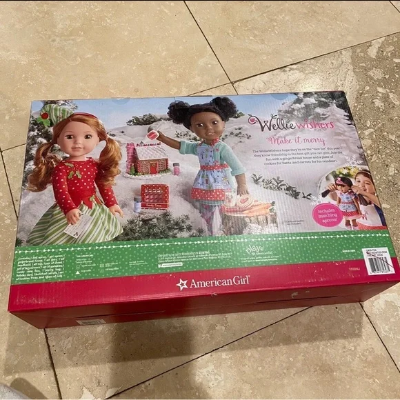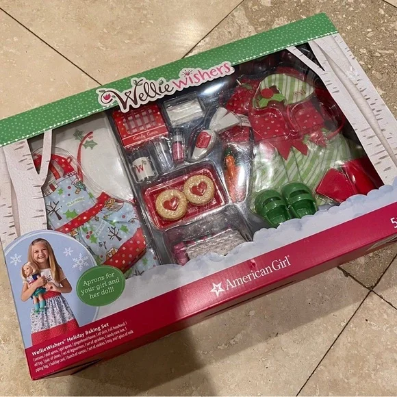 Brand new. American girl wellie wishers Christmas holiday baking set. Line through barcodes as shown in pictures. dolls not included .Includes: -girl apron-doll apron-gingerbread house-candy cane box-blue sprinkles-pink sprinkles-piping bag-elf top-elf skirt-elf headband-pair of shoes-set of legwarmers -tray-glass of milk-2 cookies-holiday card-bunch of carrotsCompatible with most 14” dolls such as Wellie Wishers, Glitter Girls and Hearts for Hearts.