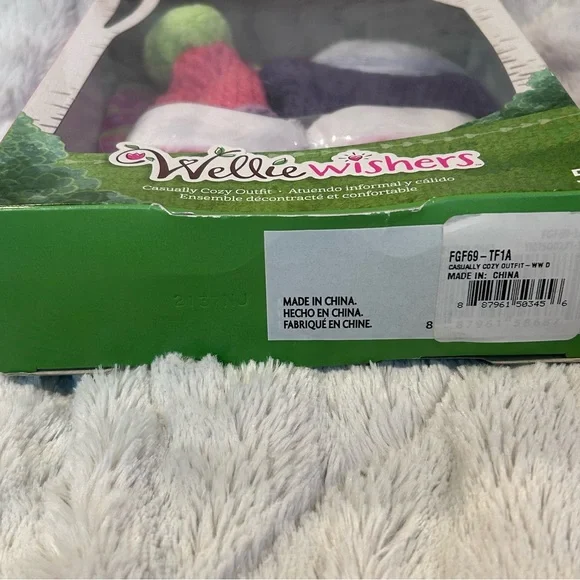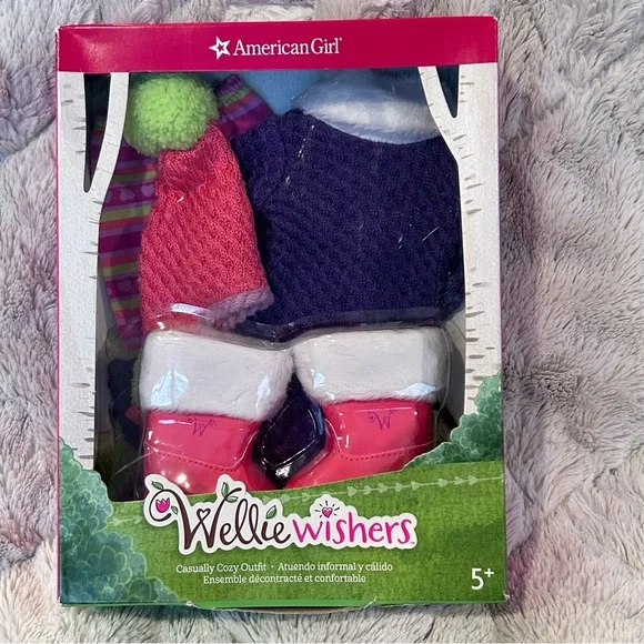 American Girl Wellie Wishers Casually Cozy Outfit. Includes: Dress, leggings, hat, boots. Bottom of the box is a little pushed inwards. See pictures.Retired item.No Doll included. Compatible with most 14.5” dolls such as American Girl´s Wellie Wishers, Glitter Girls, Hearts for Hearts, etc.