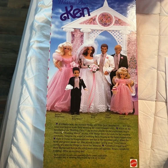 It´s finally here, the moment Midge and Alan have dreamed of... and they need your help to make their wedding the most romantic ever! When all the members of the Wedding Party™ are in their places, let the excitement begin!Hum the "Wedding March" as you walk Midge down the aisle for the wedding ceremony. Imagine the sound of wedding bells ringing as the happy couple kiss Now it´s time for congratulations and fun at the reception party! When the bride and groom sneak out, then appear in their "going away" honeymoon outfits, it´s time for Midge to throw her bouquet. W "Goodbye! Good luck!" shout Barbie and Ken as the newlyweds drive off together. What a wonderful wedding! What an exciting day!Dolls and gift set each sold separately. Dolls cannot stand alone.Available only in Wedding Party™ Gift Set with all six dolls!Smoke free home