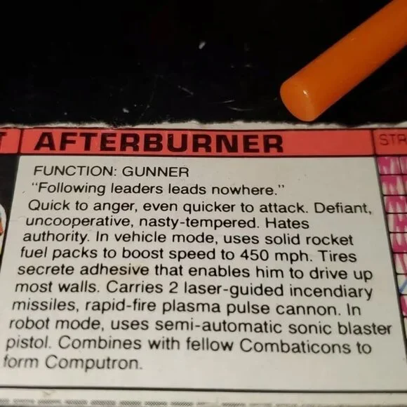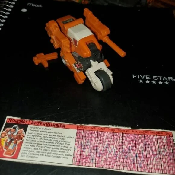 I only had one Technobot and Afterburner is it. He´s complete with a File Card that has a misprint in the file line of goods description which indicates he´s a Combaticon(see photo) instead of a Technobot that is part of Computron. Collections of Ninja Turtles, Star Wars, GI Joe, Transformers and more so check out our page. Bundle for savings on shipping.