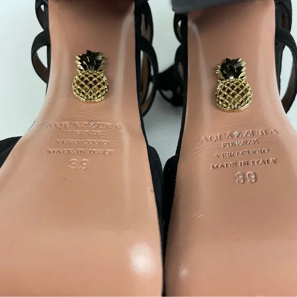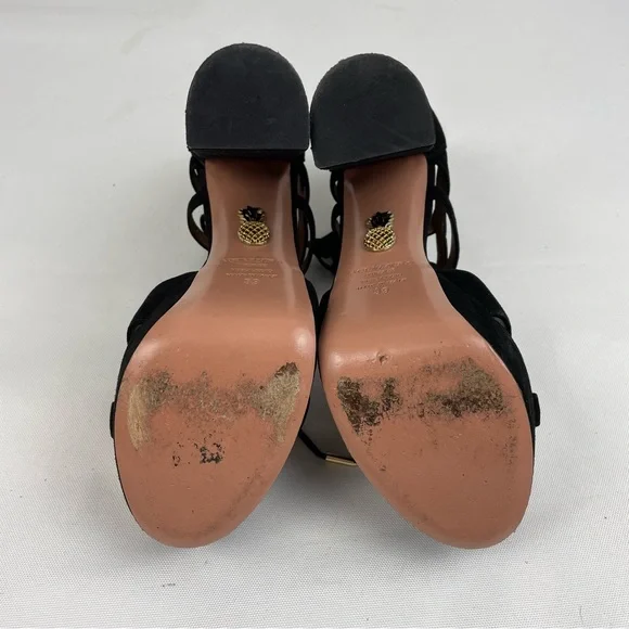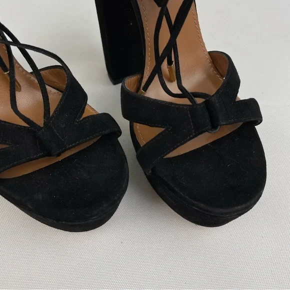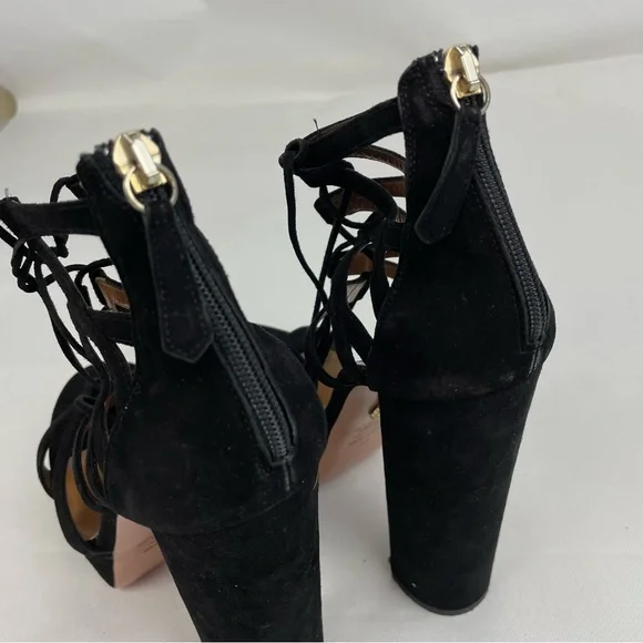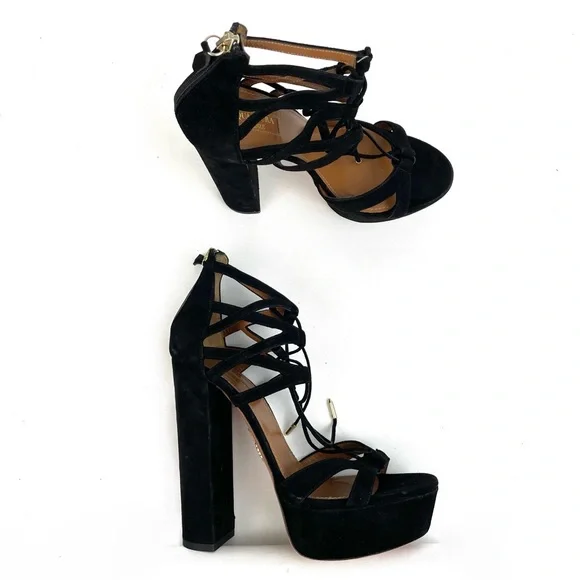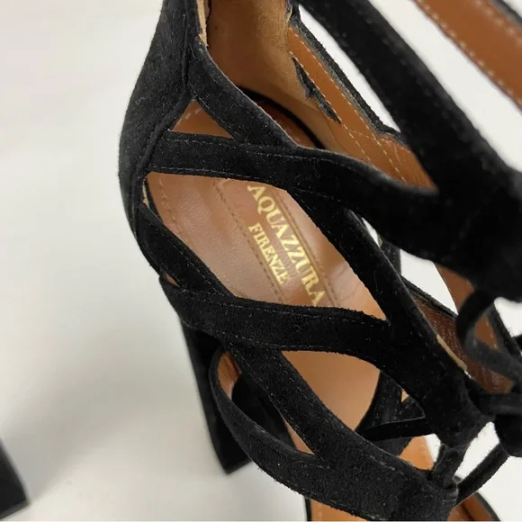 Aquazzura Beverly Hills Heels• Size 39 US 9• Black Color• Suede Leather Material• Platform Tall Height• Lace Up Open Toe• Great Preowned Condition with light signs of normal wear
