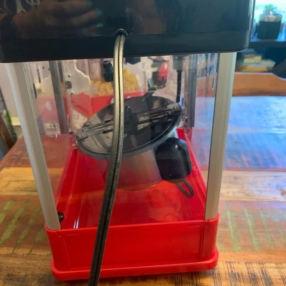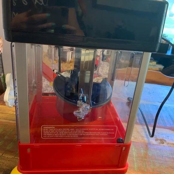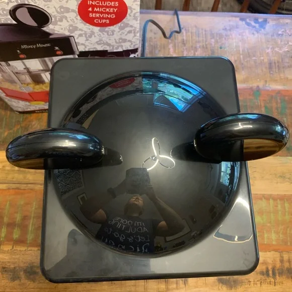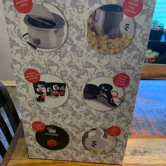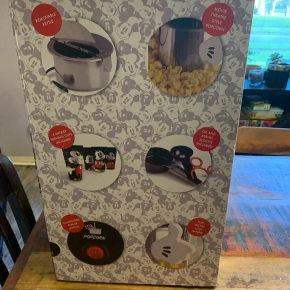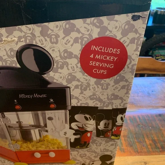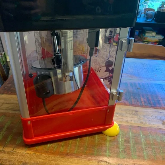 Make movie theater style popcorn at home with this Disney Adult Mickey Mouse Kettle Popcorn Maker. The vibrant red color and classic Disney design make this popcorn maker a must-have for any Disney fan. It uses oil to make perfectly crispy popcorn every time. This popcorn maker is perfect for movie nights at home or as a gift for any Disney lover. Its small size makes it easy to store and use. Get ready to impress your guests with this fun and unique popcorn maker.Look closely at pictures for any damage as this is used and should be assumed to be in fair condition. The box does have some marks on it (see pictures). It was tested for power, but not functionality - it does turn on and appears to be working normally, but was not tested for functionality.Does not include the cups or scoops.Will need oversized shipping.
