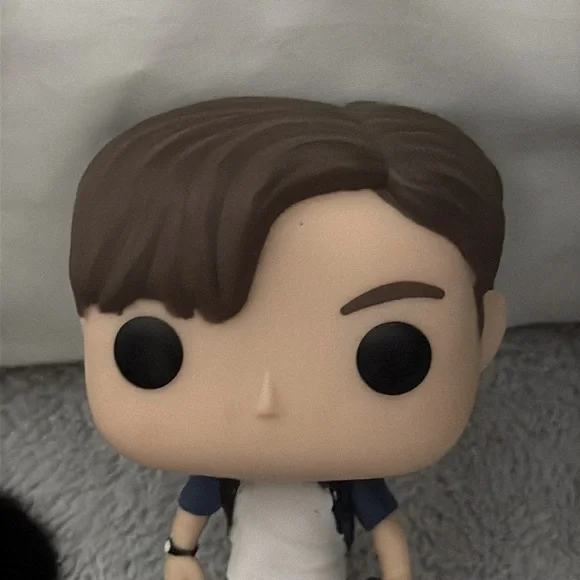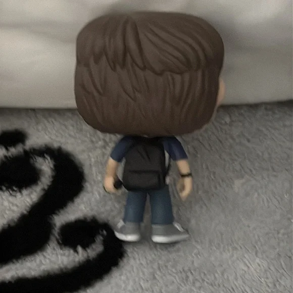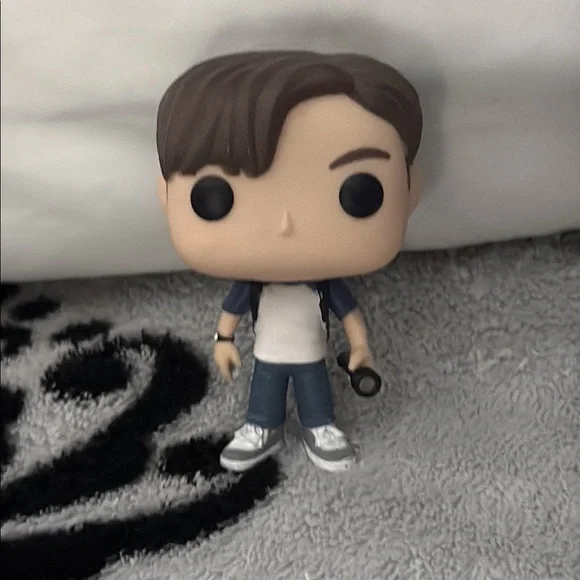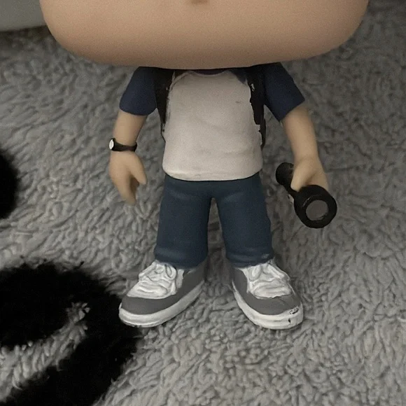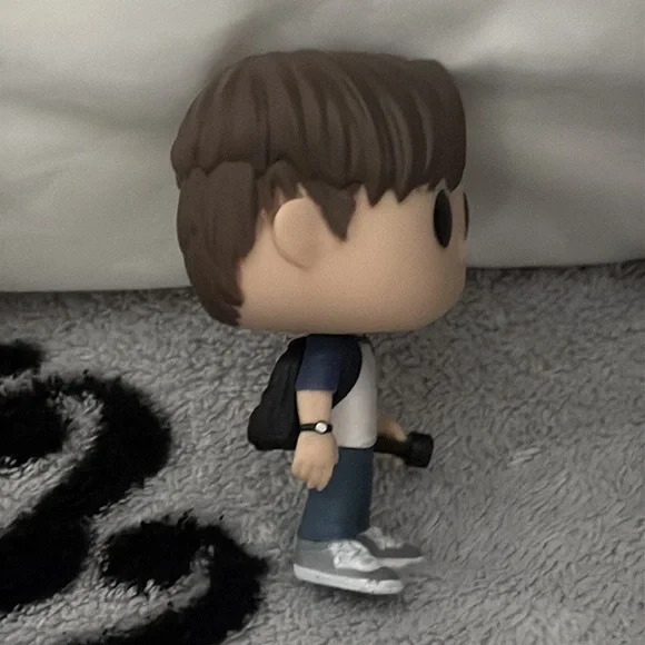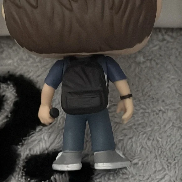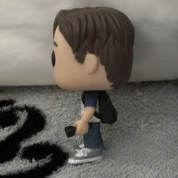 Funko Pop Movies IT Bill with Pistol Vinyl Figure #537 Bill vinyl figure holding a microphone, wearing a blue and white tee, jeans, gray sneakers and a black watch on his right wrist! Also carrying a black backpack! See pics for details, measurements approximate, new no box, stock and irl pics included