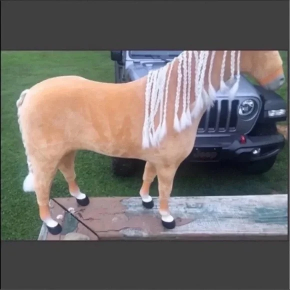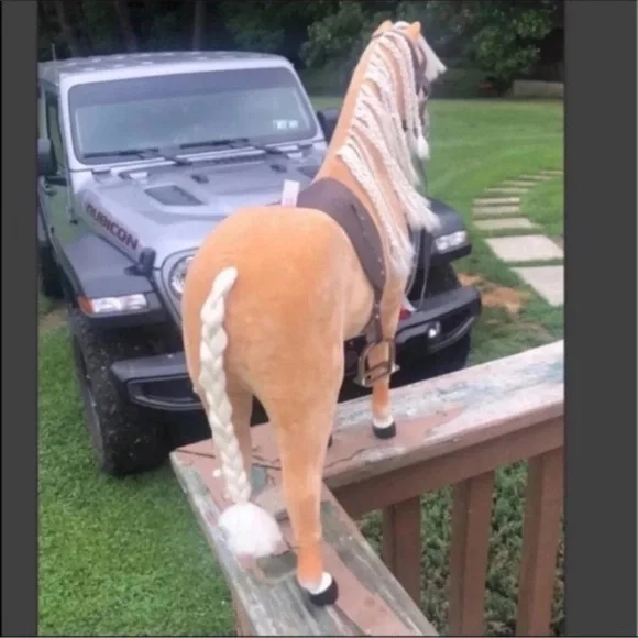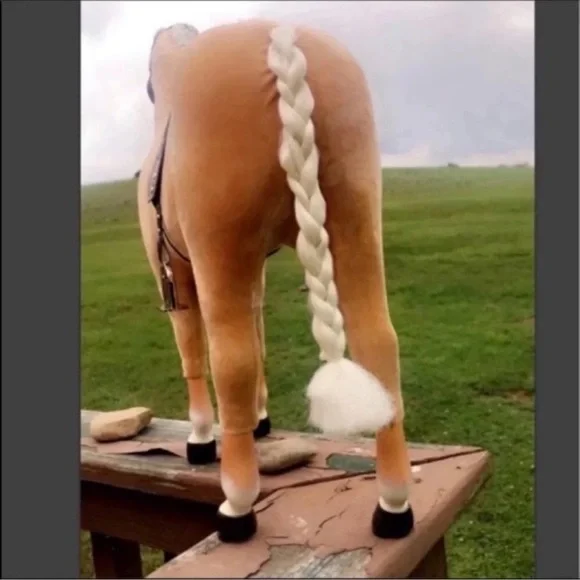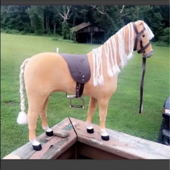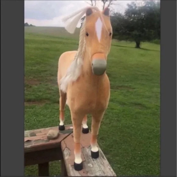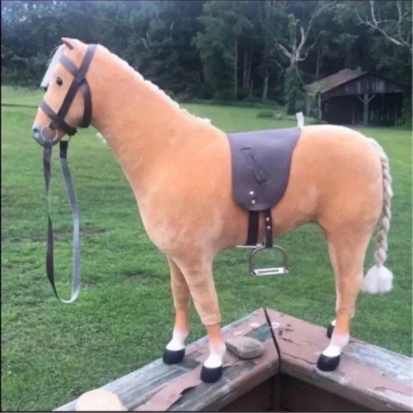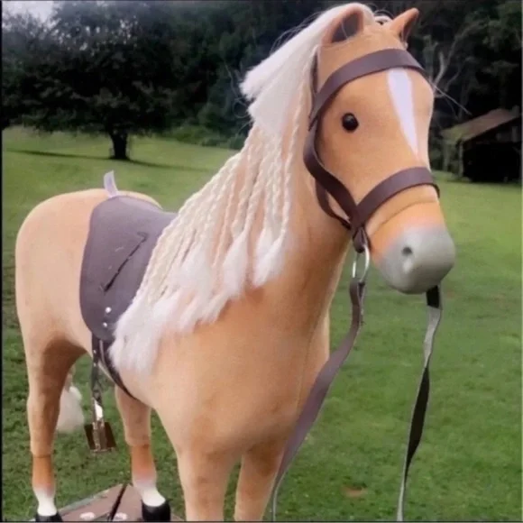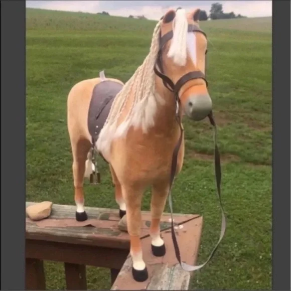 American Girl RETIREDPalomino Horse & accessoriesHorse is in good used condition, gently played with. Has a few scratches from play on nose and legs. (Nose and leg hoof area is a plastic material, body is a soft material) American Girl tag has been removed from horses back left leg. Mane is braided. Ends have a little poof. The accessories are the saddle, stirrups(2- one for each side), and halter. AG tag is still attached to the saddle piece. Please review all images, horse is exactly as shown in pictures. Will be safely packaged for shipping. Ships next day!Smoke free homeFor play with 18” Doll