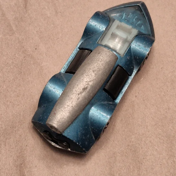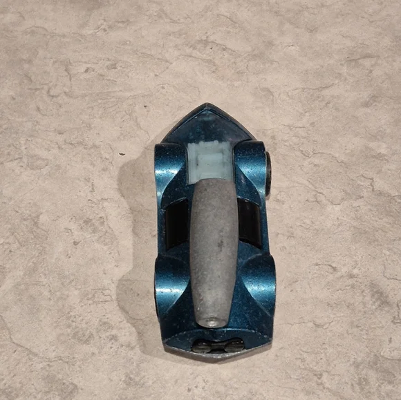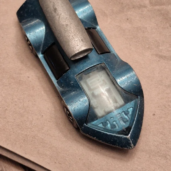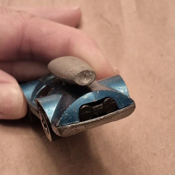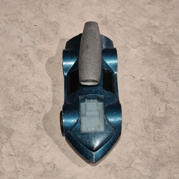Sleek vintage toy car in metallic blue. Features a unique design with a streamlined shape.