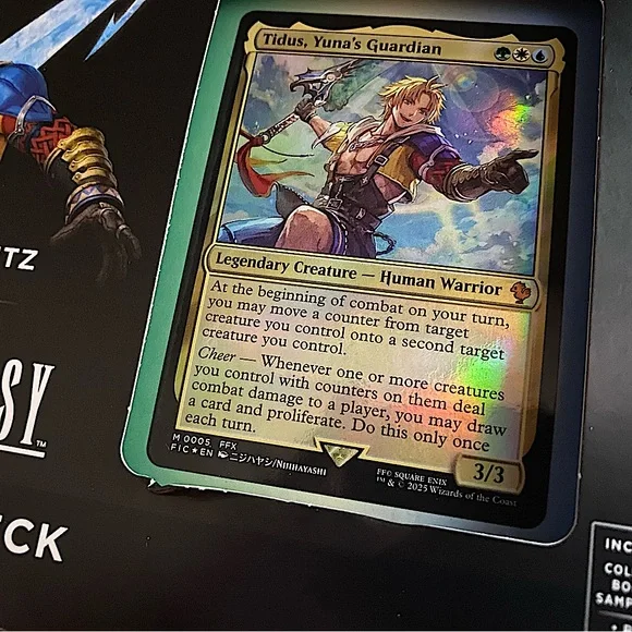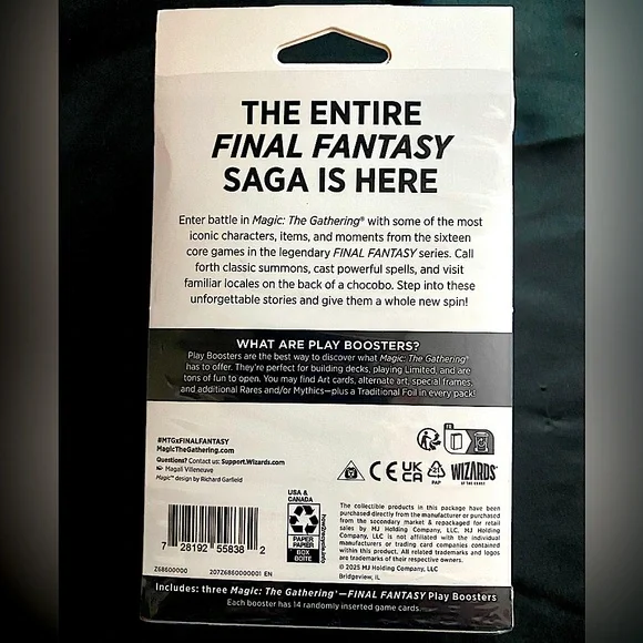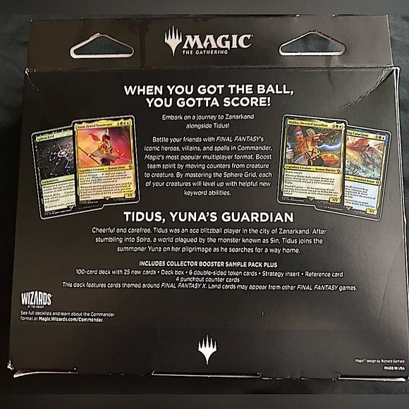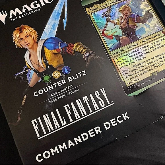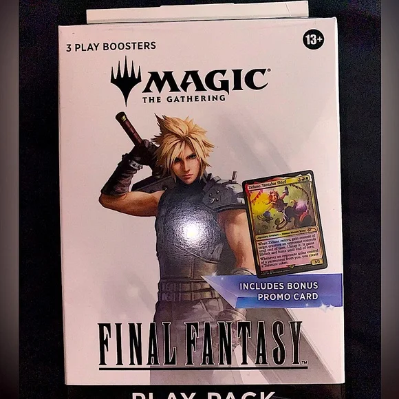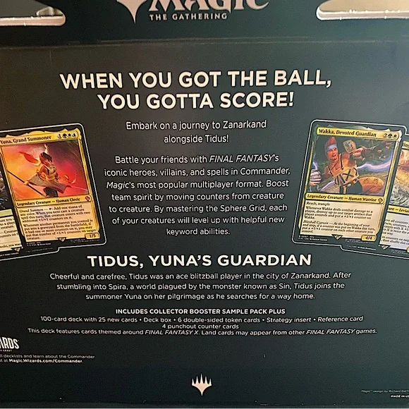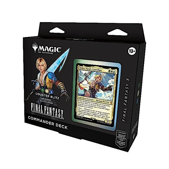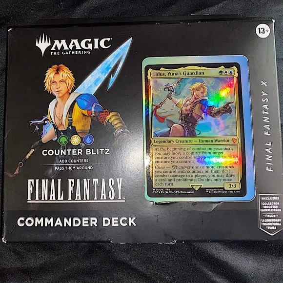 ✨Magic: The Gathering Final Fantasy X Commander Deck - Counter Blitz:✨-FINAL FANTASY X-THEMED DECK—Battle your friends with iconic heroes, villains, & spells with strategic gameplay-WHEN YOU GOT THE BALL, YOU GOTTA SCORE!—Embark on a journey to Zanarkand alongside Tidus, Yuna’s Guardian as you buff your creatures with counters & pass them around to boost team spirit.- 25 NEW CARDS + NEW ART: All 100 cards in this ready-to-play deck feature new FINAL FANTASY-themed art, including 25 Commander cards entirely new to Magic-2 FOIL LEGENDARY CARDS: Each deck includes 2 Legendary Creature cards with a shiny Traditional Foil treatment that can be played as your commander. Each deck also comes with a 2-card Collector Booster Sample Pack containing 2 alternate-border cards at least 1 of which is a shining Traditional Foil. •CONTENTS—1 Counter Blitz FINAL FANTASY X MTG Commander Deck (100-card Green-White-Blue deck), a 2-card Collector Booster Sample Pack, 6 double-sided token cards, 4 punchout counter cards, 1 deck boxRetail: $109.99✨Magic The Gathering X Final Fantasy Play Pack✨Enter battle with some of the most iconic characters, items & moments from the 16 games in the FINAL FANTASY series. Play Boosters are the best way to discover what Magic: The Gathering has to offer.Perfect for building decks, playing Limited, and are tons of fun to open.You may find Art cards, alternate art, special frames, and additional Rares and/or MythicsRetail:$39.99
