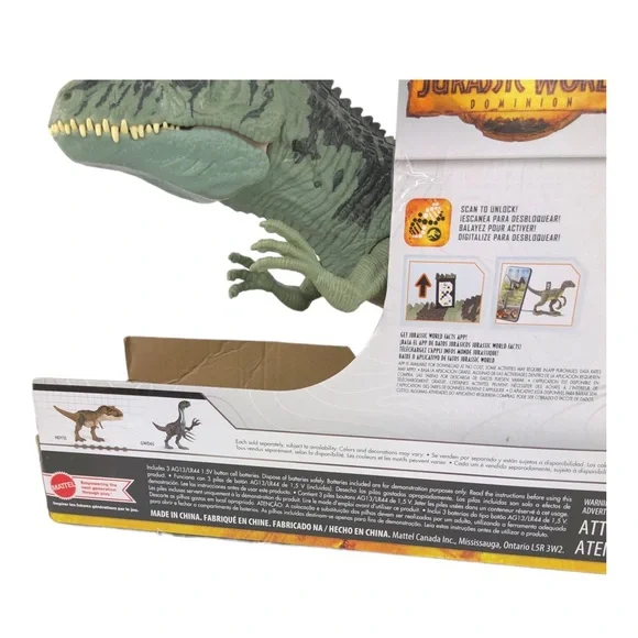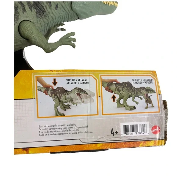 NEW IN PACKAGE!Jurassic Park Dominion Strike N´ Roar Giganotosaurus.Strike ´N Roar!​The Giganotosaurus is a breakout villain in Jurassic World Dominion.Bring the striking, roaring predator home with this 21-inch long figure sure to enhance any dinosaur collection.-Activate the side to side neck thrash by pressing the button on top. Recreate thrilling attacks from the movie!-​Open the jaw to CHOMP and activate a mighty ROAR by pressing the buttons underneath the tail.-​Bring the Giganotosaurus to LIFE through AR ! Download the free Jurassic World Facts App and scan the DNA code to experience the extended digital play. Smart device is not included.