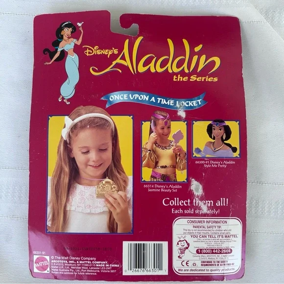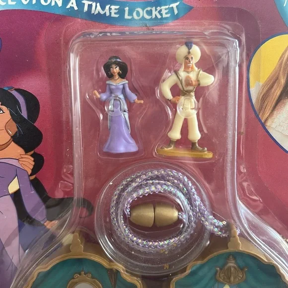 Disney Aladdin Playset Once Upon A Time Locket NEW never opened 90s collectible by Mattel Includes mini Jasmine and AladdinStored in smoke free environmentPackage is 8” x 10” .. locket closed is approximately 2.5” x 2.5”