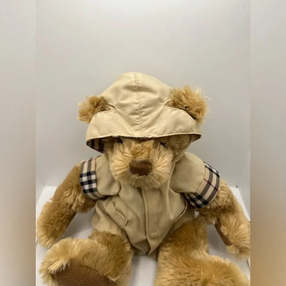 Authentic Burberry 2007 Teddy Bear wearing a Khaki jacket with Nova check plaid trim......attached hood is lined with Nova plaid.....jacket closes down the front with a strip of velcro. Jacket can be removed.