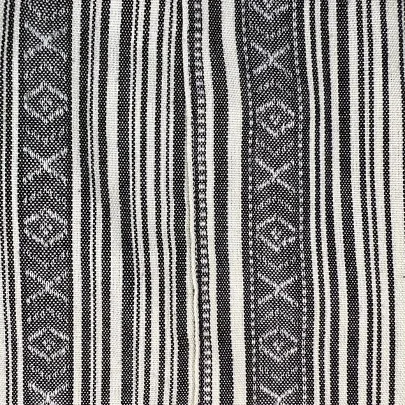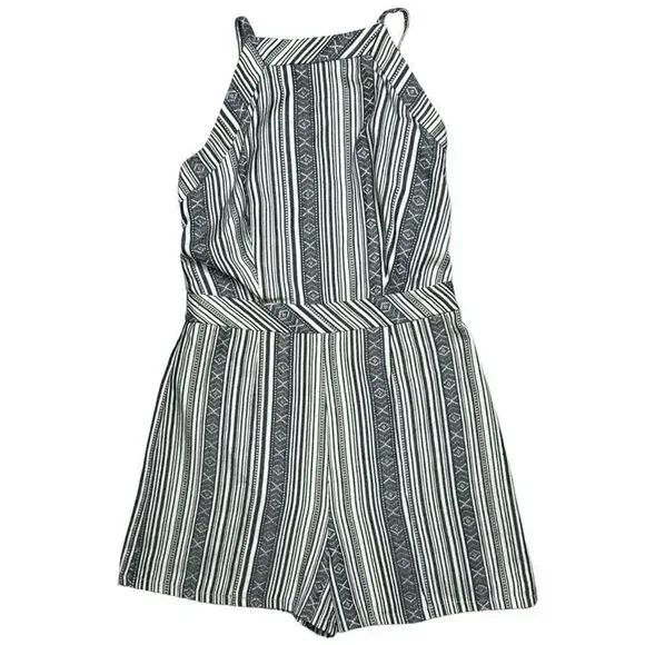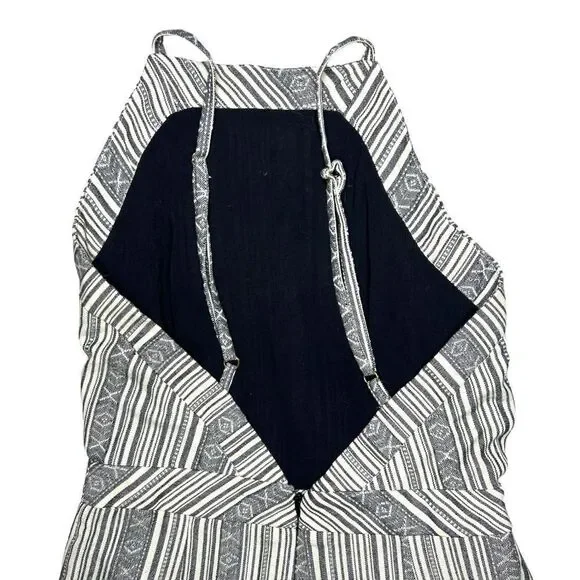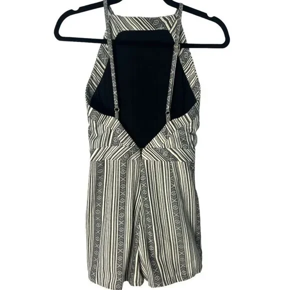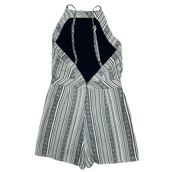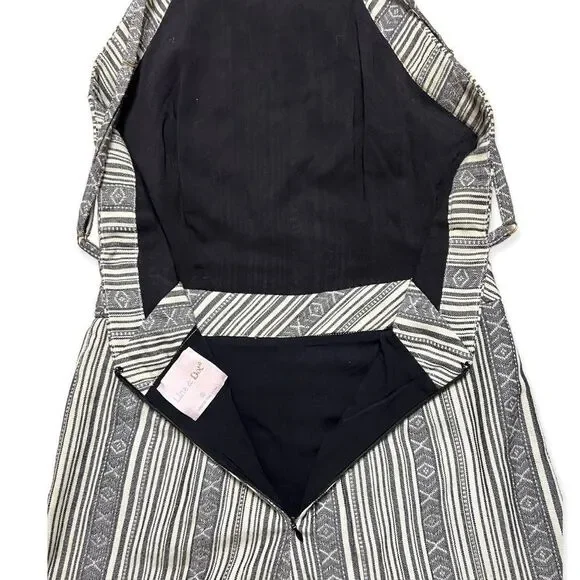 Line and Dot High Neck V Back Mojave Stripe Print black and white RomperGeometric Stripe Print High Neck Deep V Back Tweed type materialFraying of the shorts inner lining - does not affect the fit or look Approximate MeasurementsChest - 14"Waist - 13"Length - 29"Inseam - 2.5"Great Used ConditionSize XSFestival. Boho. Fall. Bohemian. Western. Summer. Fall. Casual.