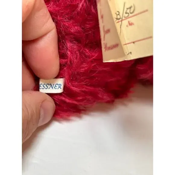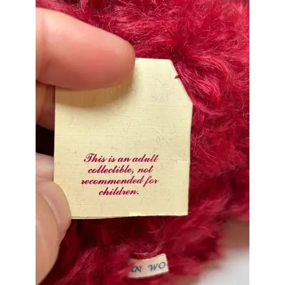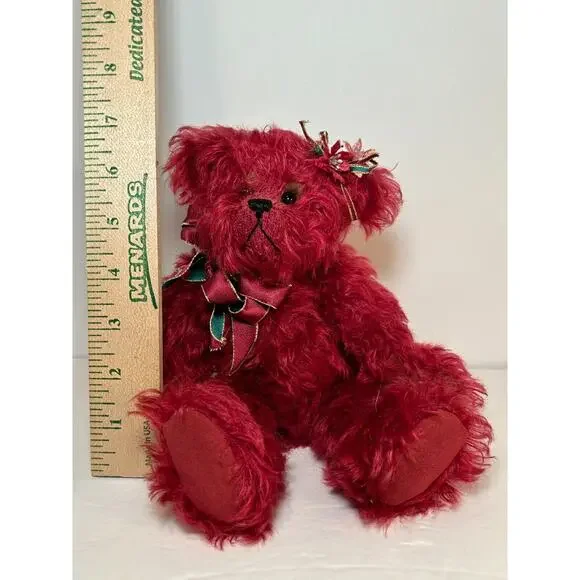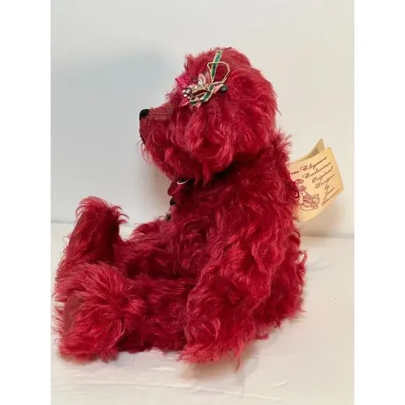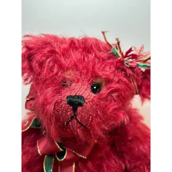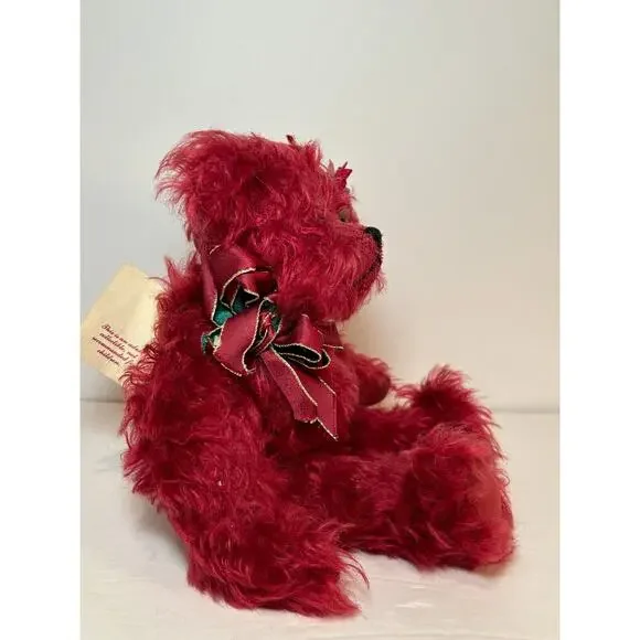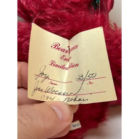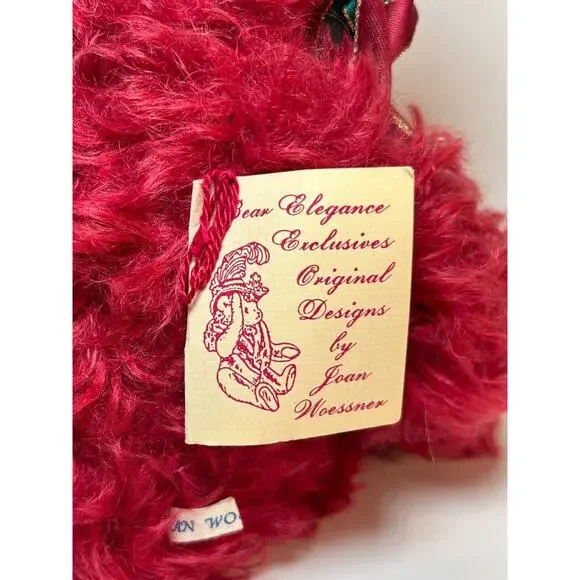This elegant limited edition teddy bear by Joan Woessner is a collectible treasure. Crafted in 1994 for Bear Elegance Exclusives, "Joy" is #23 out of just 50 made and is signed by the artist. Made of rich burgundy mohair with detailed stitching, a holiday ribbon bow, and a floral headpiece, this bear is a standout in any collector´s display. A rare and heartfelt piece for bear lovers and mohair collectors alike.Brand: Bear Elegance ExclusivesArtist: Joan Woessner (signed)Edition: Limited, 23/50Year: 1994Name: “Joy”Color: BurgundyMaterial: Mohair, polyfillSize: Approx. 12" seated (see photo with ruler)Features: Fully signed, original tag, decorative accessoriesCondition: Excellent pre-owned conditionHandmade: YesOrigin: USA
