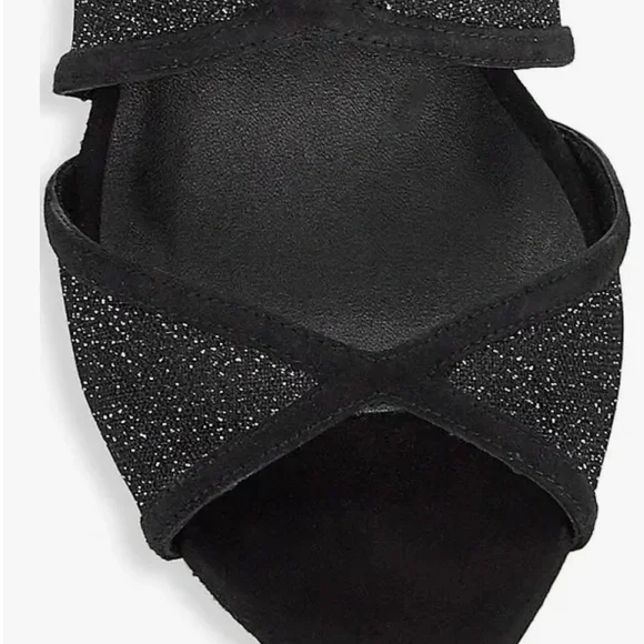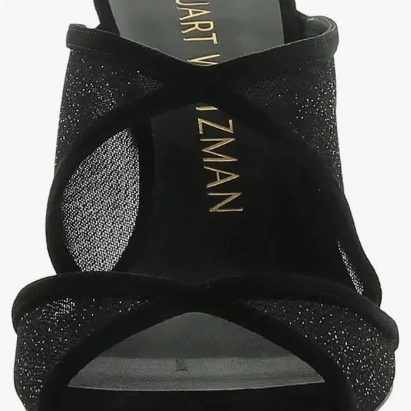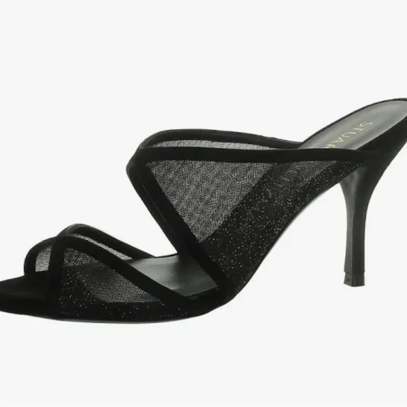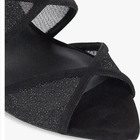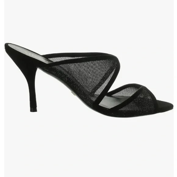 Step out in style with these elegant black heels. Perfect for any occasion, these shoes offer both comfort and sophistication.An absolutely beautiful shoe! Slip OnPointed Open ToeStilettoThe heel height is 4 inches and the color is Sparkle Mesh/Suede.There is a slight red line over the name on the bottom of the shoe to denote final sale, and they cannot be returned.