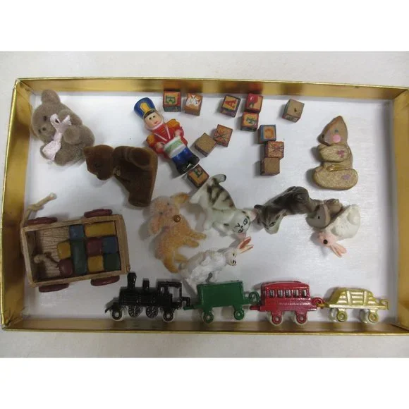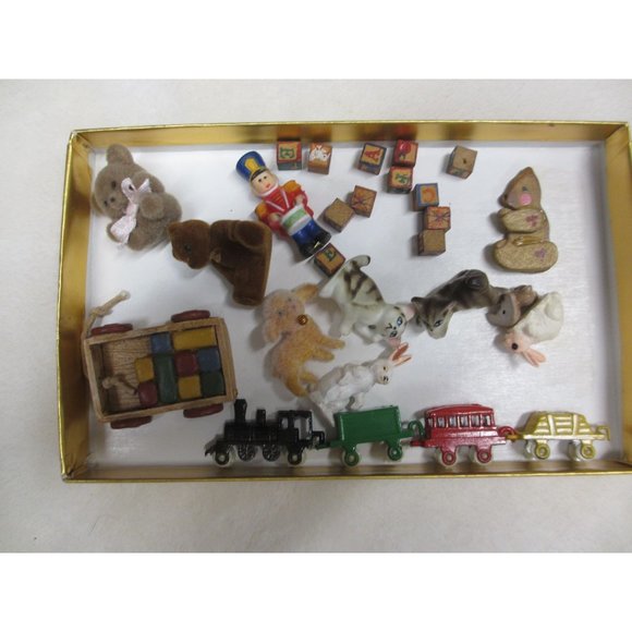 MINIATURE DOLL HOUSE TOYS4 TRAIN CARS4 BEARS1 LAMB2 BUNNIES2 KITTIES1 NUTCRACKER1 SCOTTER WITH BLOCKES11 BLOCKS WITH LETTERS AND PICTURESTOTAL IS 26 DIFFERENT PIECES