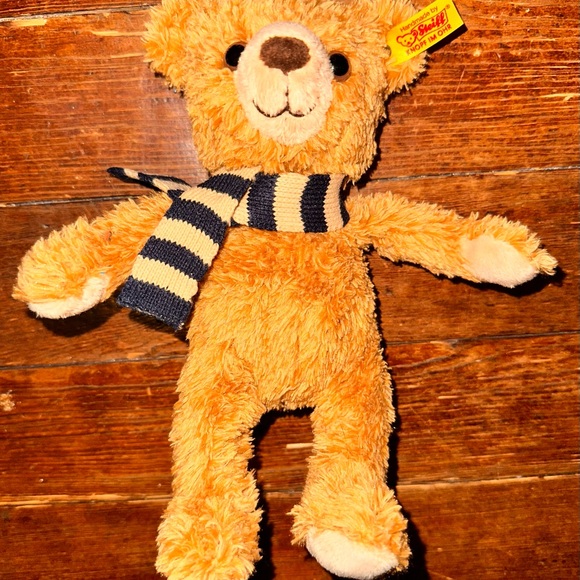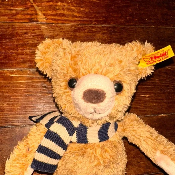 This charming stuffed teddy bear features soft brown fur and a cozy scarf, making it a delightful companion for any plush toy collection. Its friendly stitched smile and classic teddy bear design ensure it remains a timeless favorite. Crafted with quality materials, this bear is perfect for snuggling and play.