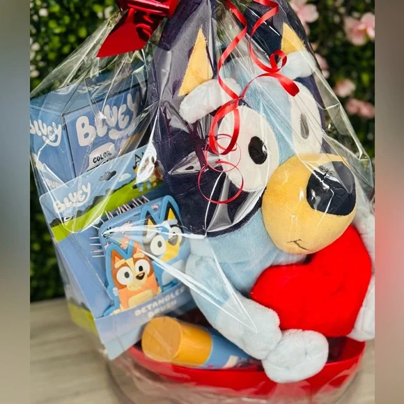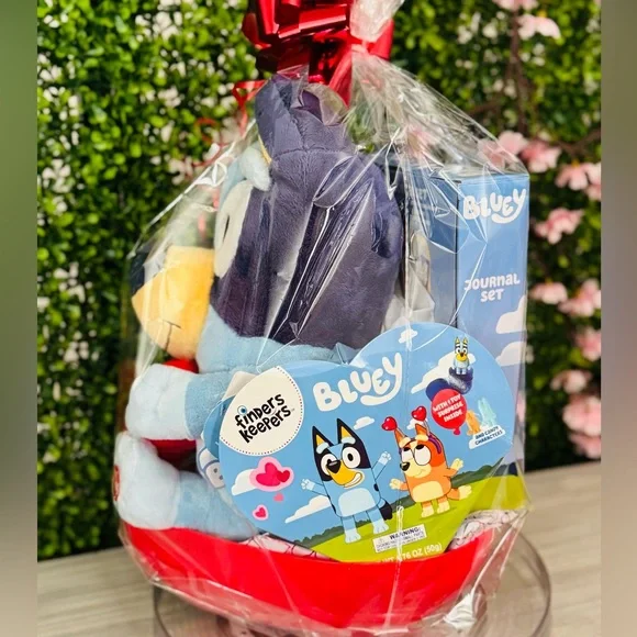 New Bluey Plush Heart light up Valentines Gift Basket Includes One plush with light on heart One heart finder’s keeper One journal set One hair brush One bubble bath bottle Bag with candies Heart shape basket Please remember we pay 20% fee of each sell!