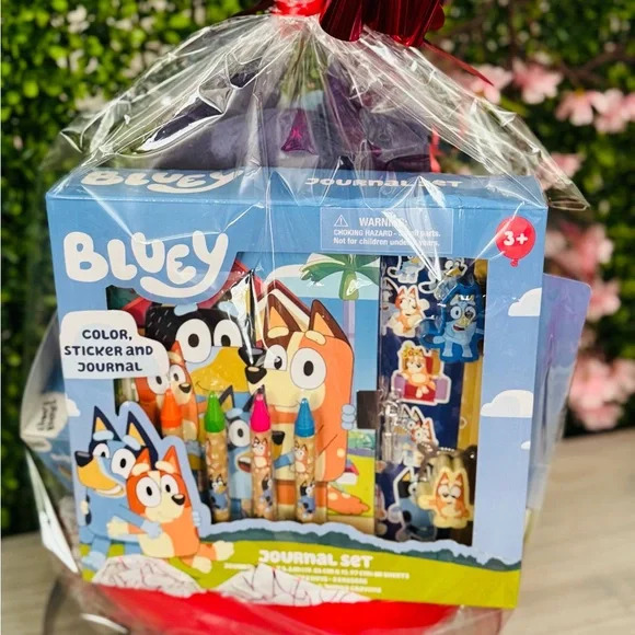 New Bluey Plush Heart light up Valentines Gift Basket Includes One plush with light on heart One heart finder’s keeper One journal set One hair brush One bubble bath bottle Bag...