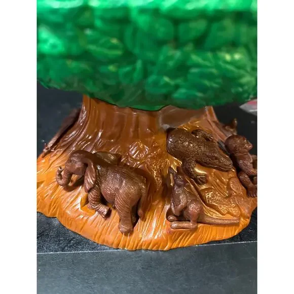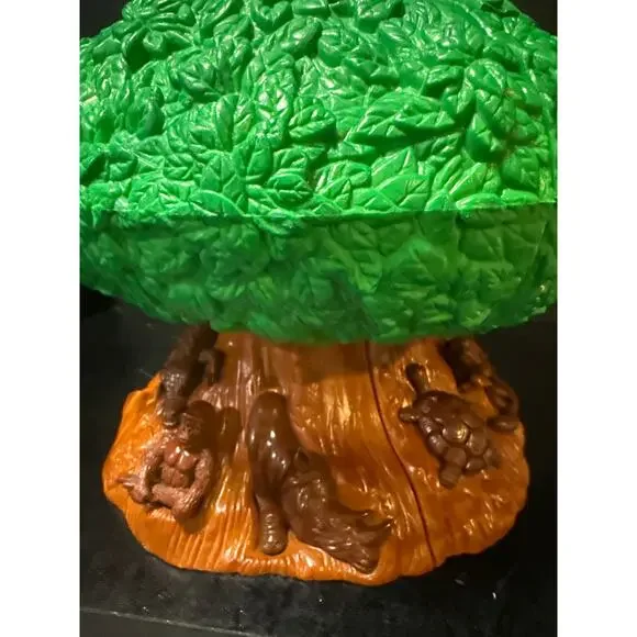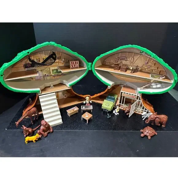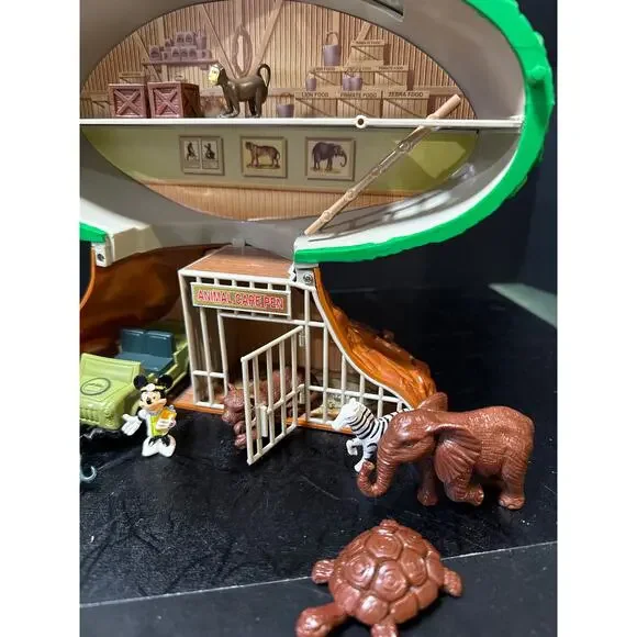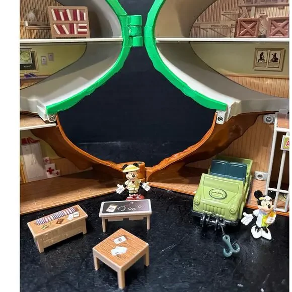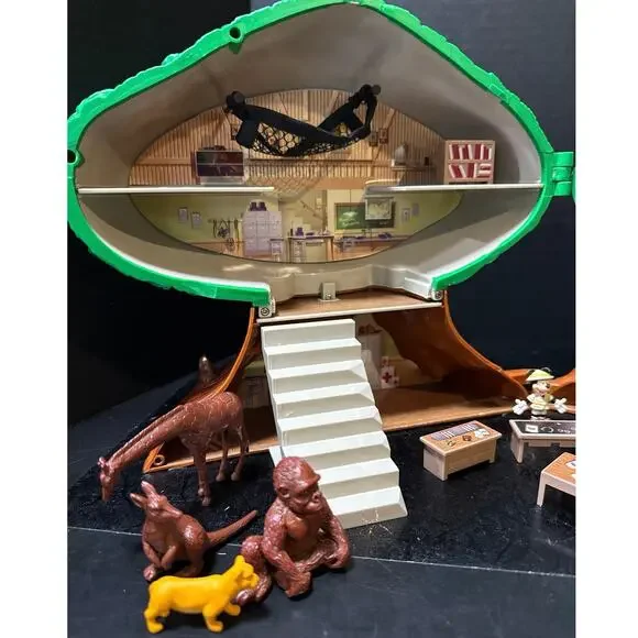 This 23-Pc. Disney´s Animal Kingdom Theme Park Tree of Life Attraction Adventure Play Setis chock full of animals, just like the attraction at Walt Disney World Resort! Open our Tree of Life to reveal an animal care facility complete with an animal care pen. The bark of the tree features animal carvings, including snakes, birds, turtles, rhinos and monkeys, some of which can be removed and played with.Set Includes:Safari Mickey, Doctor Minnie, Gorilla, Giraffe, Kangaroo, Tiger, Elephant, Turtle, Zebra, Lioness and Monkey figures.Safari vehicle with working wheels and winchAnimal care pen with working gateSwing Hammock Ladder3 tablesBookcase2 cratesStaircaseTrap door on top of Tree closes shut to store all the piecesThe only thing missing is the rope part that goes with the stairs. Please see the last picture.