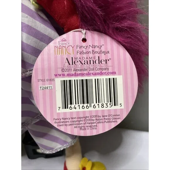 This is a vintage Madame Alexander Fancy Nancy plush toy rag doll from 2011. The 18-inch doll, designed by artist Jane O´Connor, features multicolored hair and a light complexion. It is part of the Fancy Nancy Fashion Boutique series, with detachable parts, washable clothes, and a soft body. This limited edition collector plush toy is a doll representing the character "Fancy Nancy" from the Madame Alexander fashion boutique line. New with original tags. Sold as is. Please view all photos.