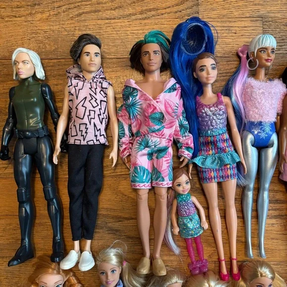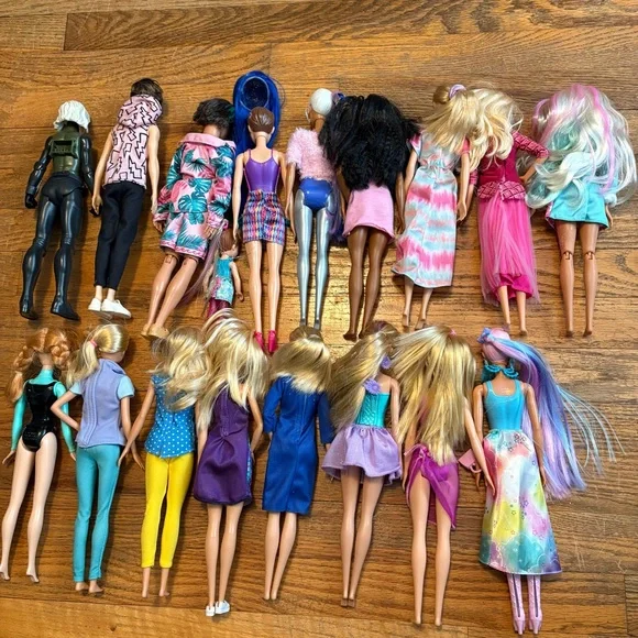 Assorted Authentic Barbie Dolls, Two Ken dolls, a Chelsea doll plus Mattel Anna from Frozen doll and Black Widow doll from The Avengers that is not a Barbie doll. Set of 18 dolls...