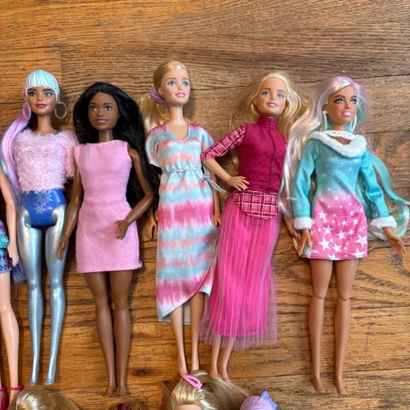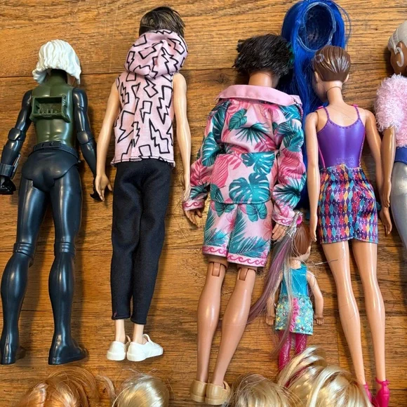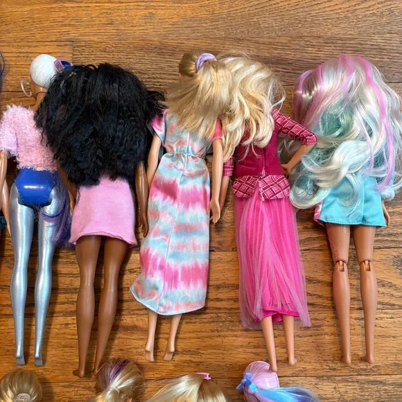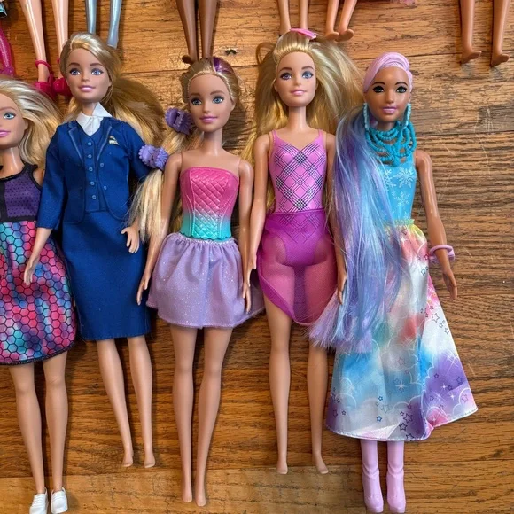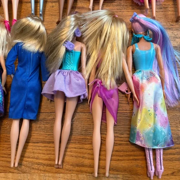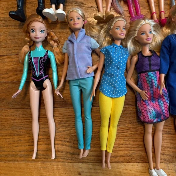 Assorted Authentic Barbie Dolls, Two Ken dolls, a Chelsea doll plus Mattel Anna from Frozen doll and Black Widow doll from The Avengers that is not a Barbie doll. Set of 18 dolls will not be broken up. Must take all together. Normal play wear condition. Please see all pics. Please Note: There is a blue wig that goes with the doll below it in the pic.