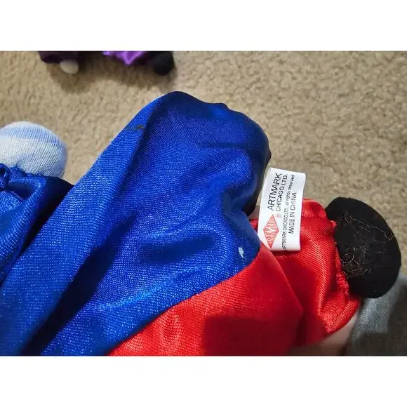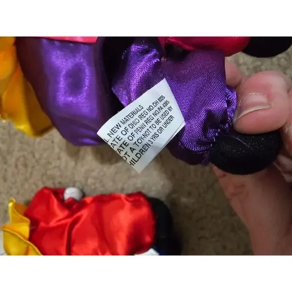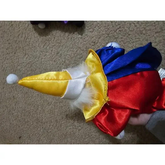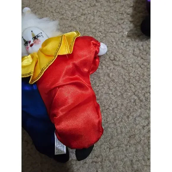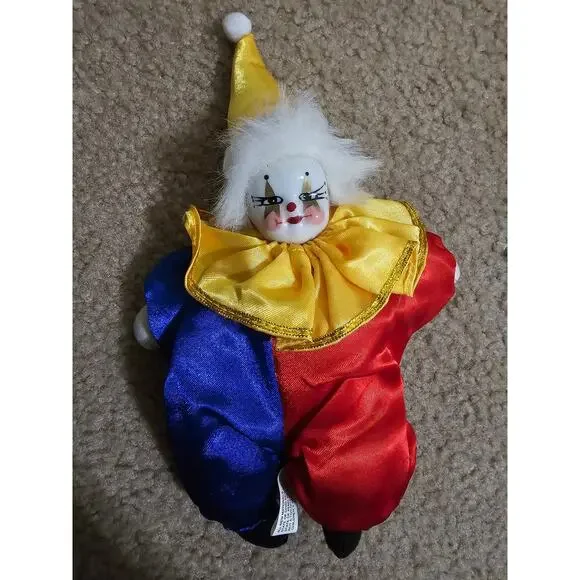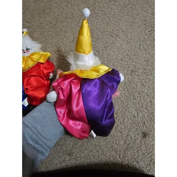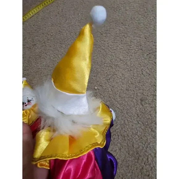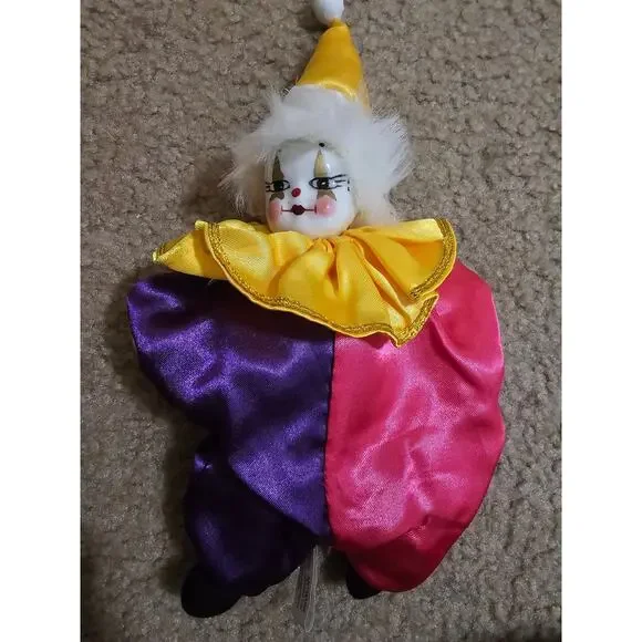 Step right up and meet this dynamic duo of vintage Artmark porcelain clowns! These delightful jesters are here to bring color, charm, and just a pinch of mischief to your collection or home decor.Perfectly pint-sized at 10 inches tall—big enough to shine but small enough to fit anywhere.Vintage Artmark tags still attached, proving these jesters are the real deal.Why You Need Them: Whether you´re a die-hard clown collector, love quirky vintage decor, or just need some hilarious conversation starters, these two are it! (Bonus points if you name them.)Don´t let them clown around too long—snatch up this colorful duo before they disappear in a puff of satin and confetti! Material: Porcelain head and hands, satin fabric costume.Design: Colorful Harlequin-style clowns with pom-pom hats.Size: Approximately 10 inches tall.Brand: Artmark (as noted on the tag).Era: Likely vintage, 1980s-1990s.Fabric Knit Type for Costume:Satin finish fabric.