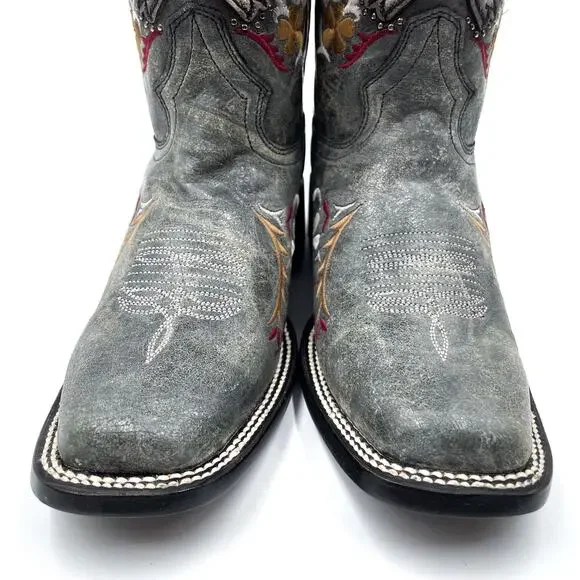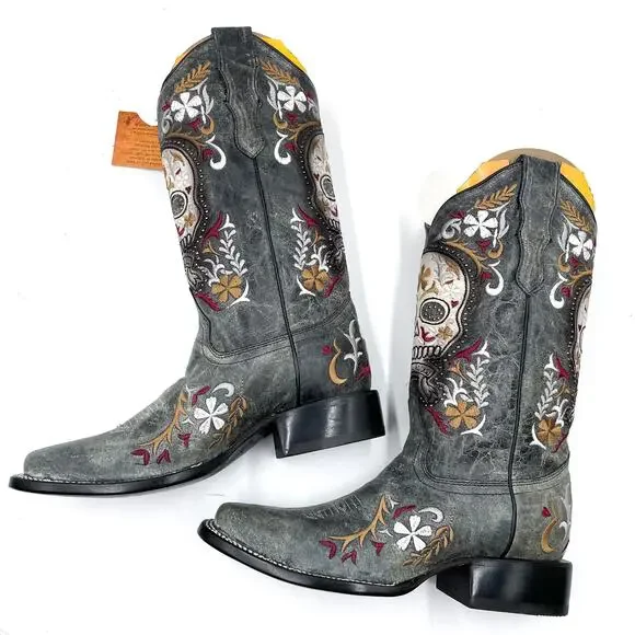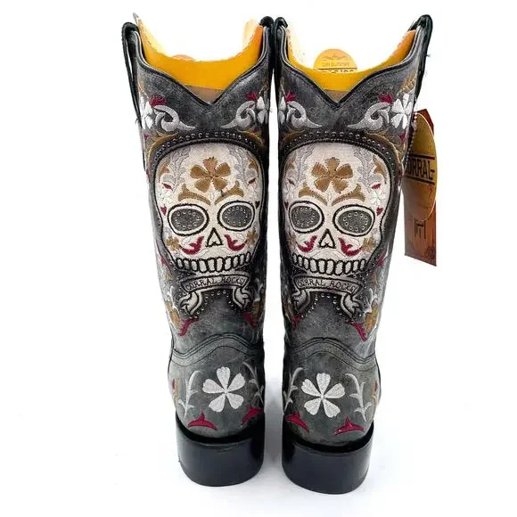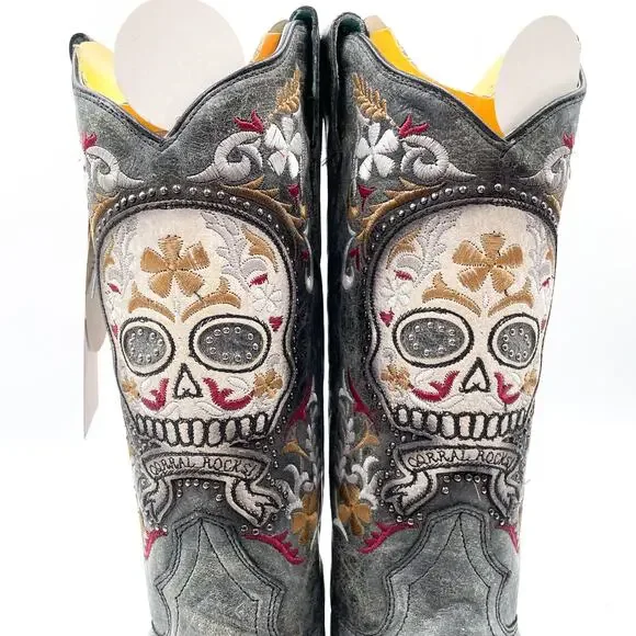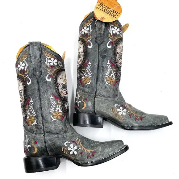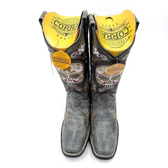 Corral E1587 Skull Embroidered Boots Gray Leather Mid-Calf Western Sz 8.5 New with Tags, no box.EmbroideryOverlayFloralSkullMid calfPull OnSquare toe