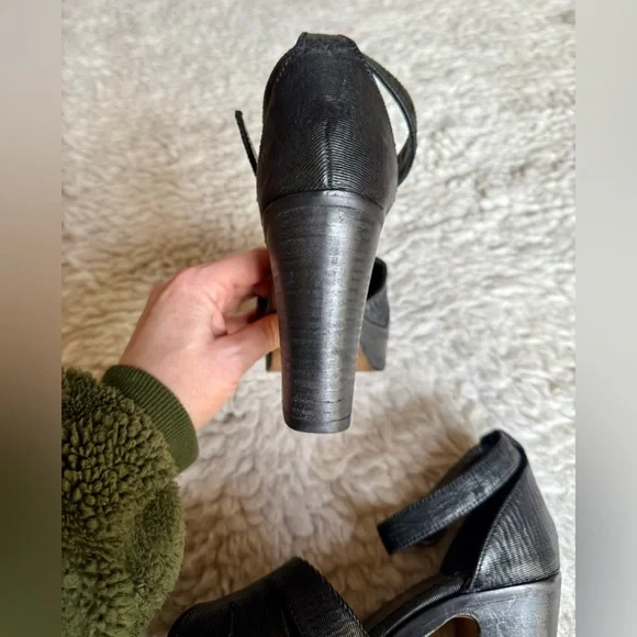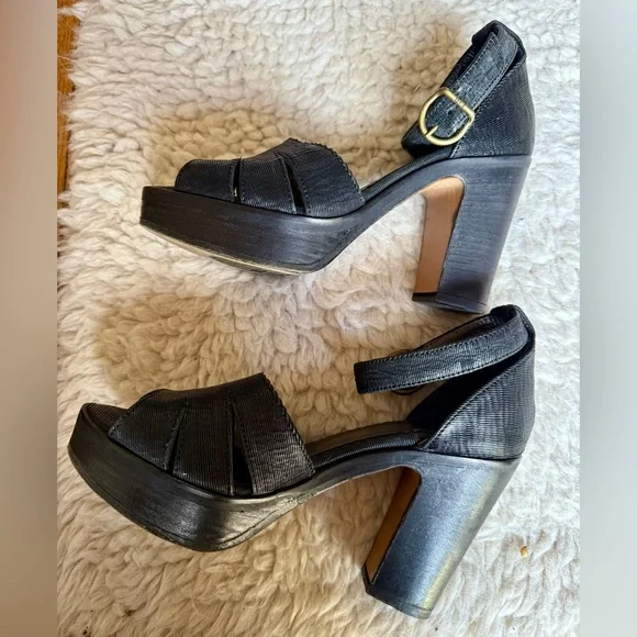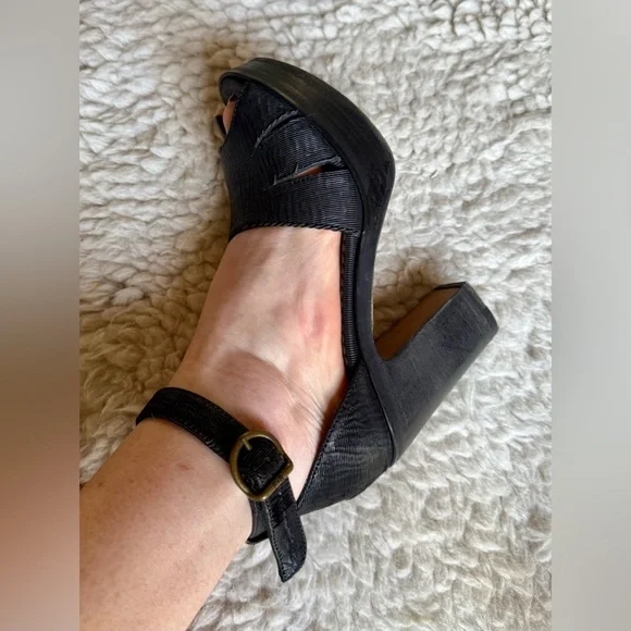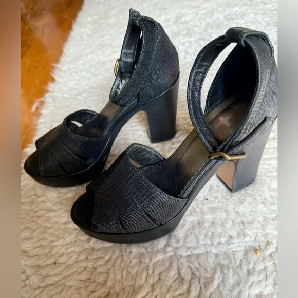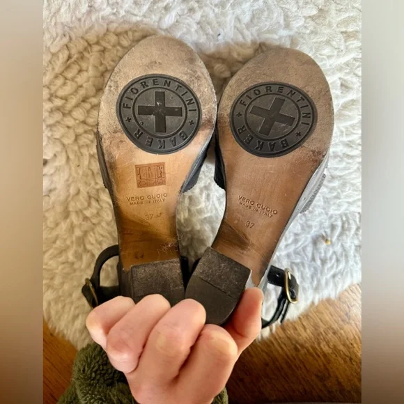 Stunning Fiorentini + Baker black platform block heel sandals. I normally wear a 38 and a 7.5, but I had to size down to 37 on these. I think this is closest to a true 7.5. They are extremely comfortable for the height. In near new condition, wore these twice and stuck in closet, wont wear enough to keep. No flaws except minor scuffing on sole. 4 inch back, 1 inch front, so 3inch foot raise