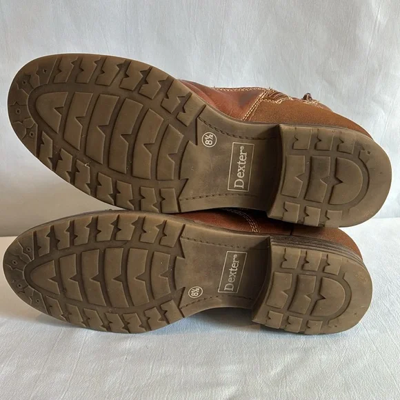 Dexter, faux cognac brown leather, faux Sherpa lining, lace up ankle boots.Side zipCap toePre-owned in good condition, normal wear, the left heel shows more wear than the left...
