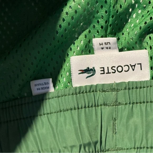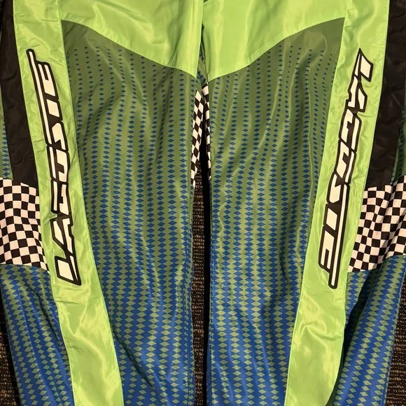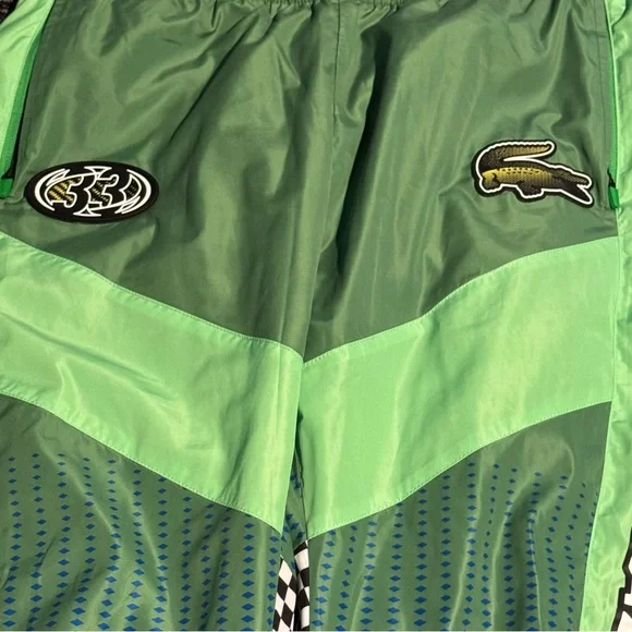 Stylish Lacoste track pants in vibrant green and blue. Features unique design elements.